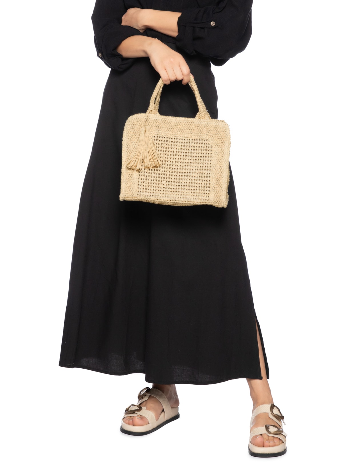 A bolsa da Basiq é perfeita para trazer leveza e um toque artesanal aos looks. Ideal para compor produções de verão, ela combina tanto com camisa ampla, saia, bolsa e brincos. O detalhe natural garante frescor e versatilidade para o dia a dia.