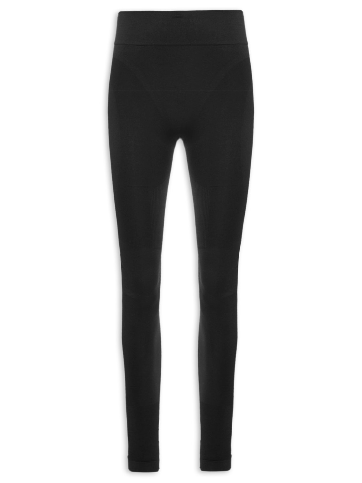 A calça preta é confeccionada em jersey com superfície canelada de média elasticidade. A peça justa ao corpo, possui cintura alta, cós elástico com nome da marca em baixo-relevo e comprimento longo.