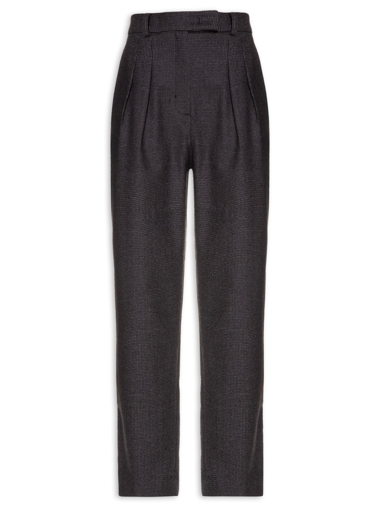 A calça cinza é confeccionada em lã. A peça possui cintura alta, cós com passantes aplicados, logo metalizado da marca aplicado na parte posterior perto do cós, bolsos frontais de modelo faca, bolsos posteriores decorativos com abas sobrepostas, pregas frontais, comprimento cropped*, padronagem xadrez em cor contrastante, comprimento cropped*, shape solto, caimento reto, acabamento pespontado e fechamento frontal por botão, colchete e zíper.