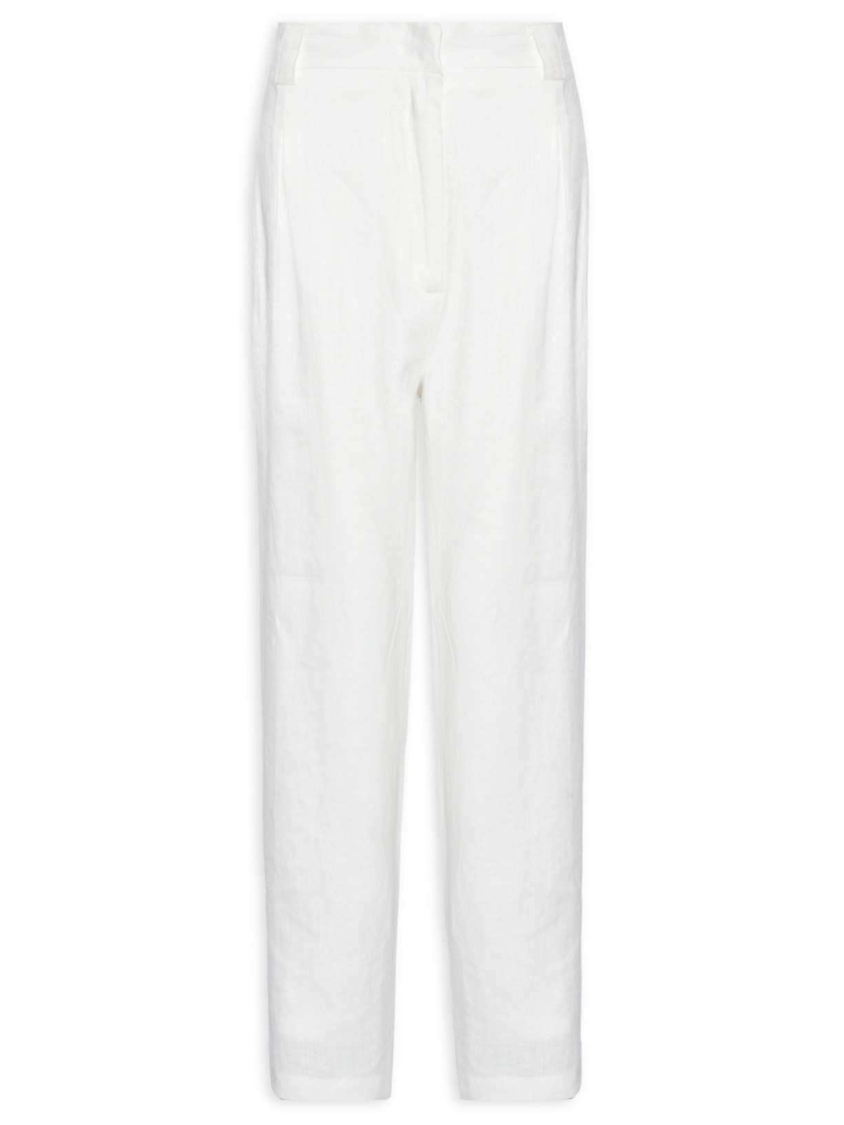 A calça branca é confeccionada em linho sem elasticidade. A peça solta ao corpo possui cintura alta, cós médio com passantes para cinto, pregas frontais, dois bolsos na parte posterior, forro, acabamento pespontado na barra, comprimento longo e fechamento por botão, gancho e zíper.