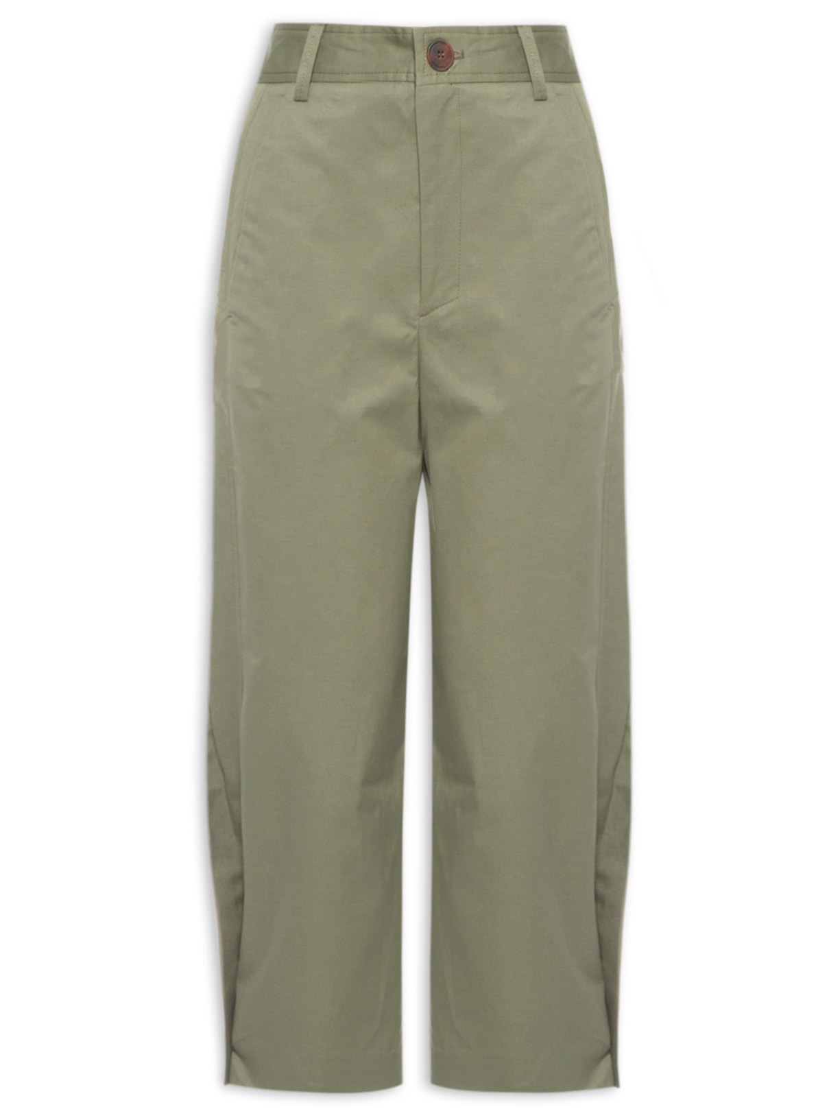 A calça verde é confeccionada em malha leve com baixa elasticidade. A peça solta ao corpo possui cintura alta, cós com passantes aplicados, bolsos frontais de modelo faca, bolsos posteriores decorativos, botão decorativo na barra, comprimento cropped* e fechamento frontal por zíper e botão.