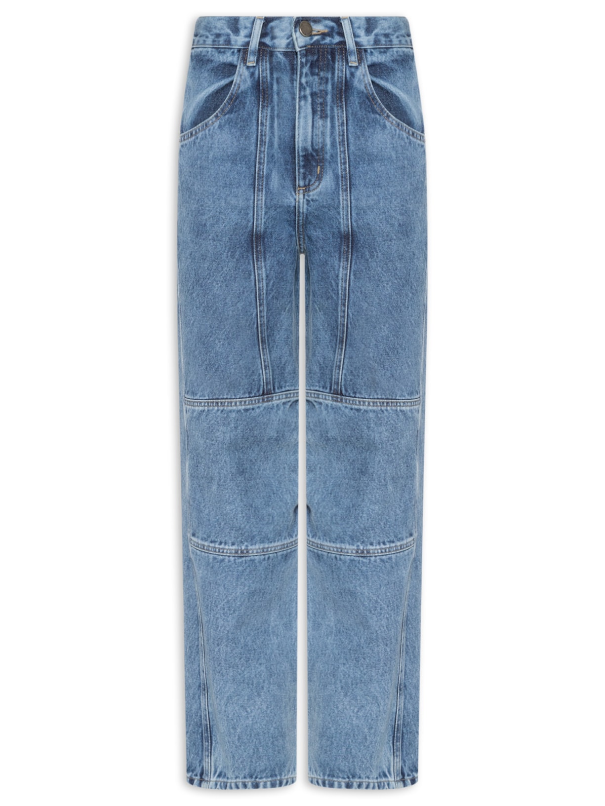 A calça azul é confeccionada em sarja com lavagem jeans sem elasticidade. A peça solta ao corpo possui cintura alta, cós com passantes aplicados, bolsos frontais e posteriores, recortes frontais e posteriores, efeito estonado, comprimento longo e fechamento frontal em zíper e botão.