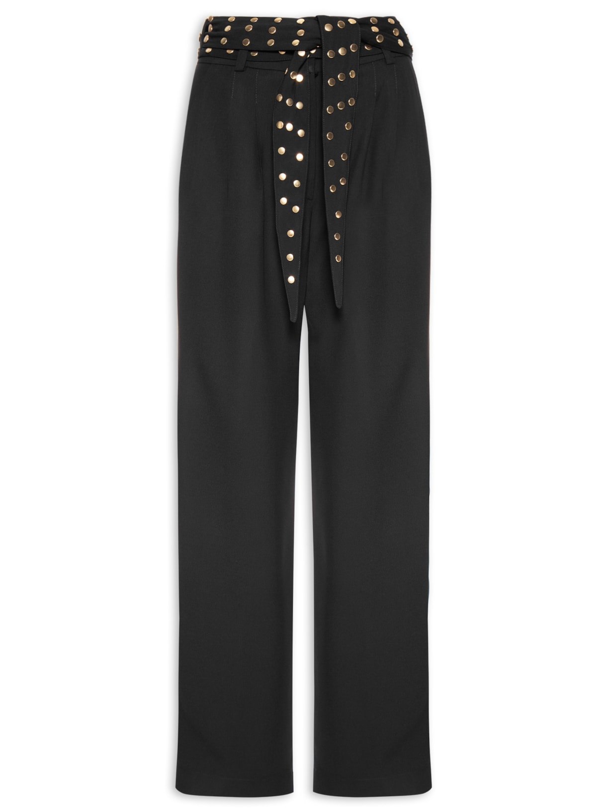 A calça preta é confeccionada em tecido leve sem elasticidade. A peça solta ao corpo possui cintura alta, cós com passantes aplicados, bolsos frontais de modelo faca, pregas frontais, bolsos posteriores, comprimento longo e fechamento frontal por zíper e colchete. Acompanha cinto em tira média da mesma cor e tecido com aplicação de tachas metalizadas para uso opcional.