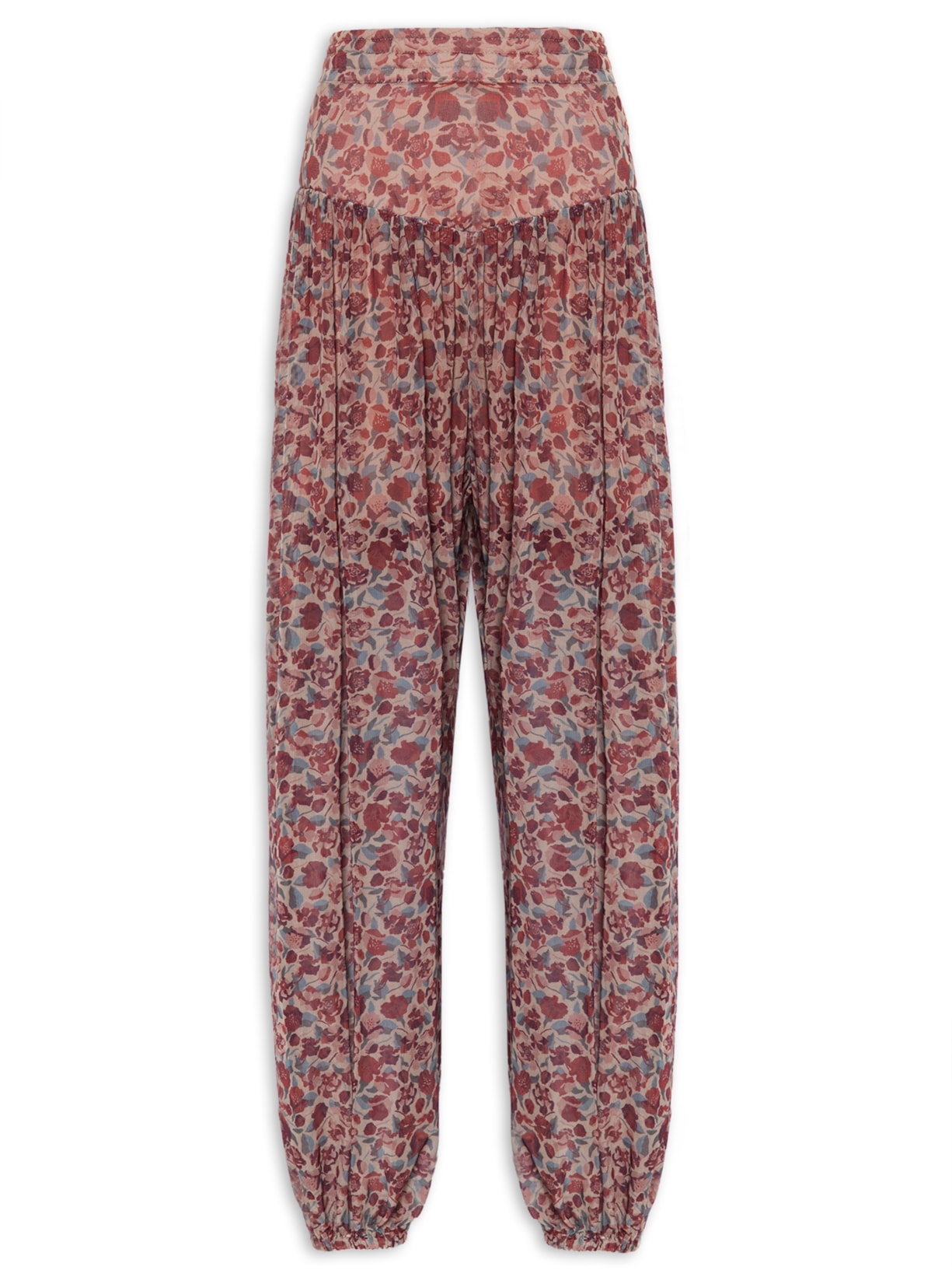 A calça vermelha é confeccionada em tule com alta elasticidade. A peça solta no corpo, de modelo jogger*, possui cintura alta, cós amplo com forro acolchoado e recortes frontais vazados, detalhes de pregas abaixo do cós, meio forro, transparência, padronagem floral em cores contrastantes e comprimento cropped** e fechamento lateral por zíper invisível e botões.