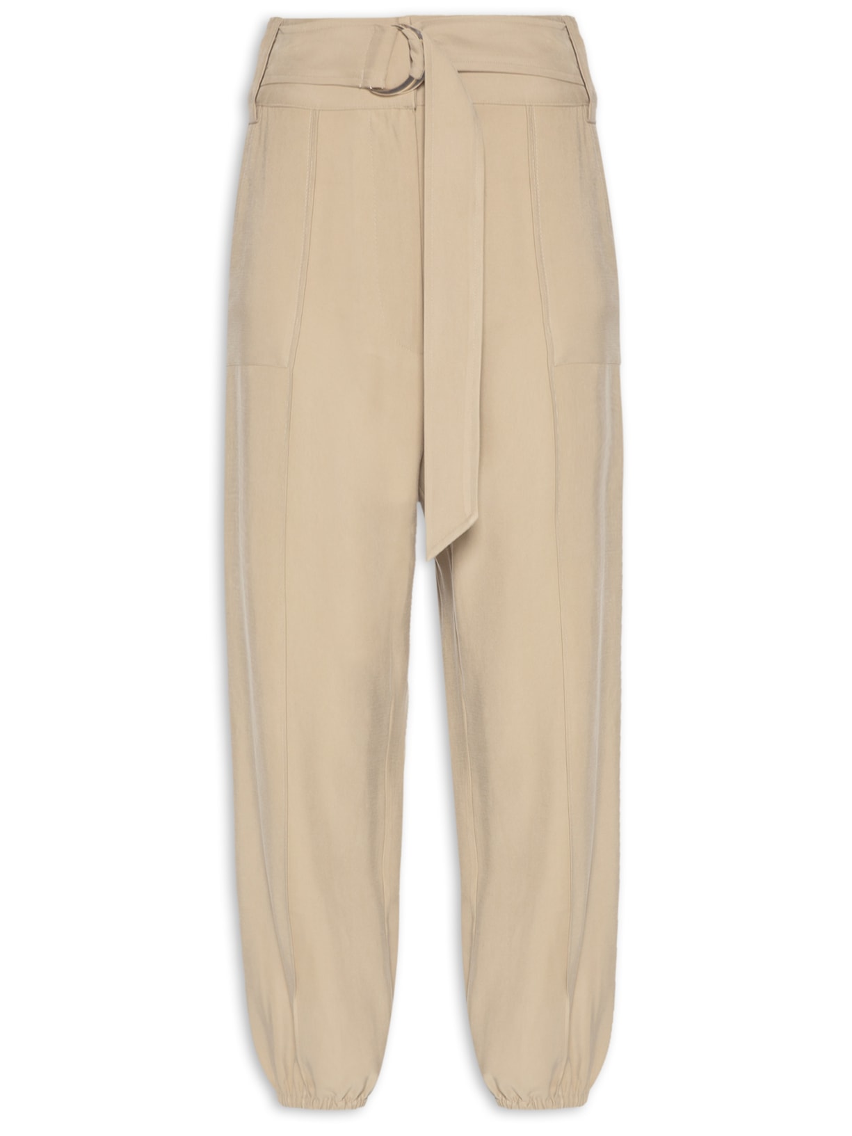 A calça bege é confeccionada em tecido leve sem elasticidade. A peça solta ao corpo possui cintura alta, cós com elástico embutido, dois passantes frontais, cinto com fivela meia lua, dois bolsos frontais e dois posteriores, tag da marca aplicada em metal na lateral, nervuras na parte frontal, barras com elástico embutido, comprimento *cropped, fechamento por botão, gancho e zíper.