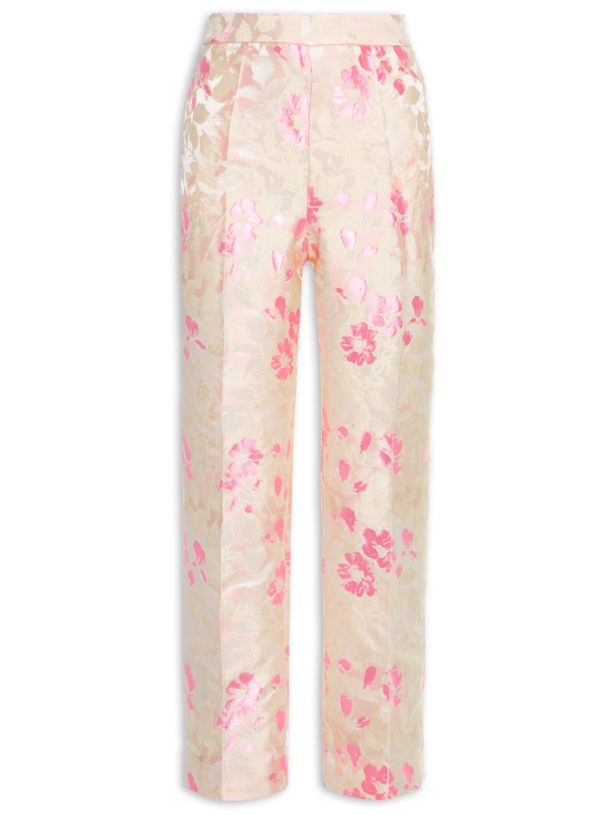 A calça rosa é confeccionada em jacquard. A peça possui cintura alta, detalhes de vincos frontais e posteriores, bolsos frontais de modelo faca, pences posteriores, comprimento cropped*, padronagem floral em cores contrastantes, shape solto e fechamento posterior por botão e zíper invisível.