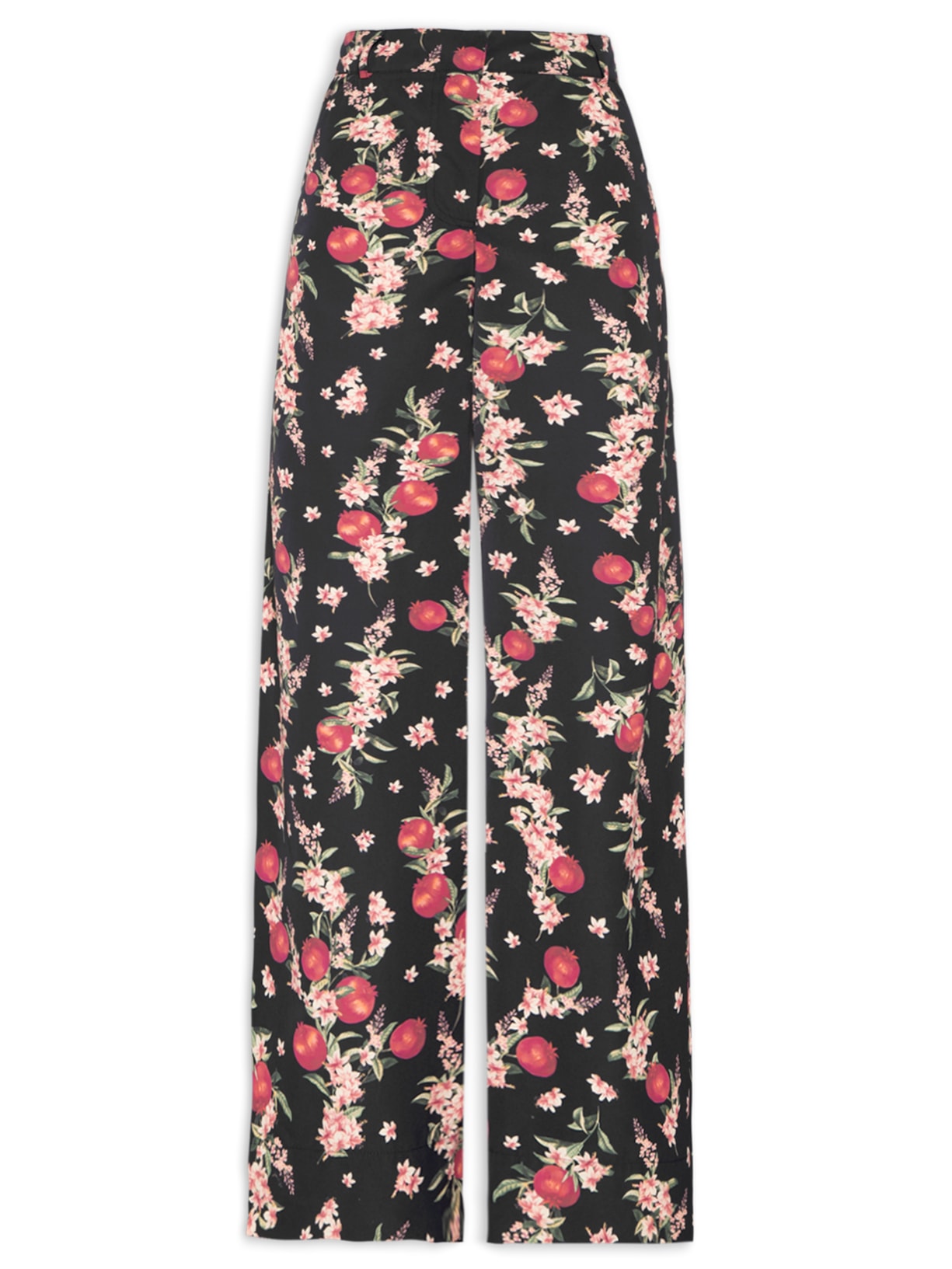 A calça preta é confeccionada em tecido leve sem elasticidade. A peça solta ao corpo possui cintura alta, cós com passantes aplicados, bolsos frontais modelo faca, bolsos posteriores, estampa floral em cores contrastantes, comprimento longo e fechamento frontal por zíper, colchetes e botão interno.