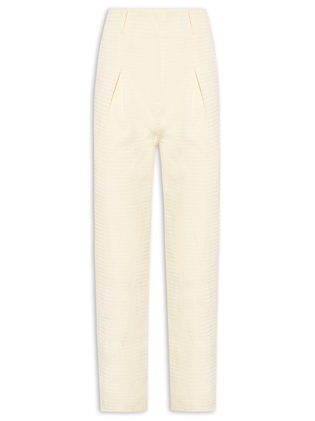 A calça amarela é confeccionada em tecido leve com superfície texturizada sem elasticidade. A peça solta ao corpo possui cintura alta, cós com passantes, recortes posteriores, bolsos posteriores decorativos, pregas frontais, bolsos frontais embutidos, comprimento cropped* e fechamento frontal por botão, colchete e zíper.