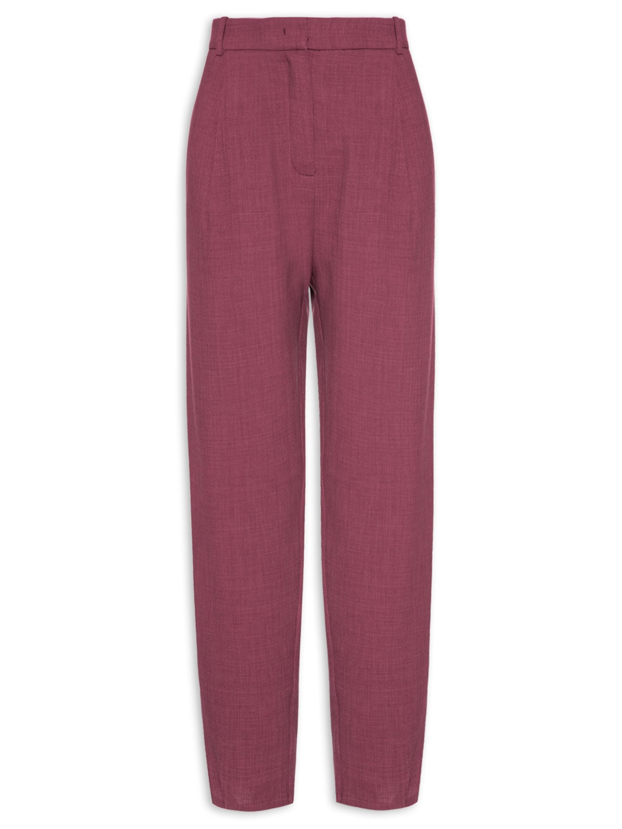 A calça vinho é confeccionada em tecido leve com superfície texturizada e sem elasticidade. A peça solta ao corpo possui cintura alta, cós com passantes aplicados e elástico embutido na parte posterior, bolsos frontais de modelo faca, pregas frontais, bolsos posteriores, barra com detalhe de pregas e martingale aplicado, comprimento cropped* e fechamento frontal em zíper e colchete.