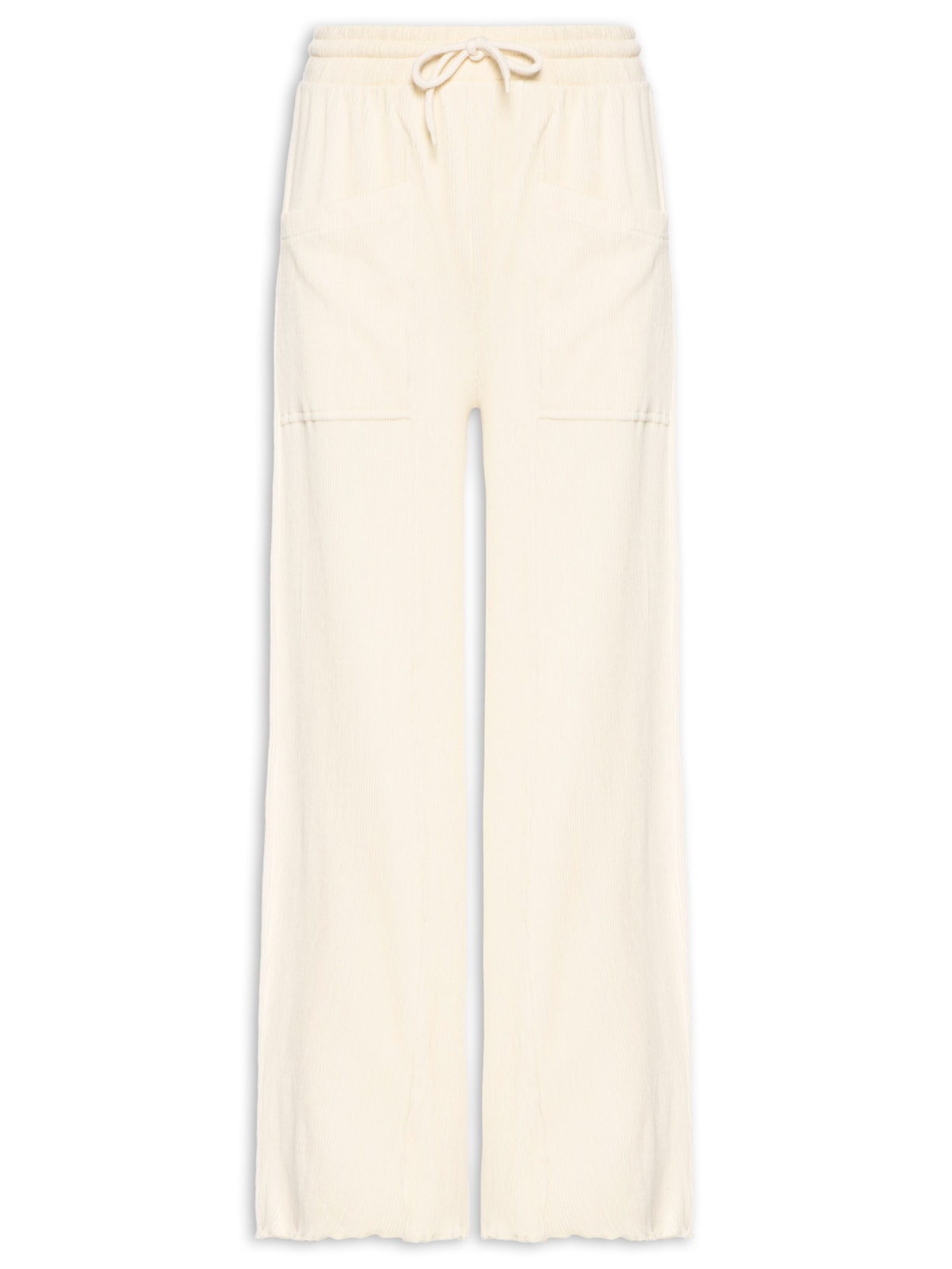 A calça off white é confeccionada em tecido leve com superfície texturizada e baixa elasticidade. A peça solta ao corpo possui cintura alta, cós com elástico e cordão embutidos, dois bolsos frontais, e comprimento longo.