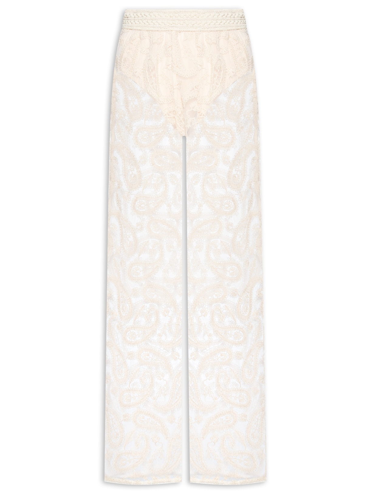 A calça bege é confeccionada em tule com baixa elasticidade. A peça solta ao corpo possui cintura alta, cós com elástico embutido, bordado paisley, transparência e comprimento longo. A calcinha hot pant é confeccionada em malha com superfície texturizada e possui laterais largas e forro.