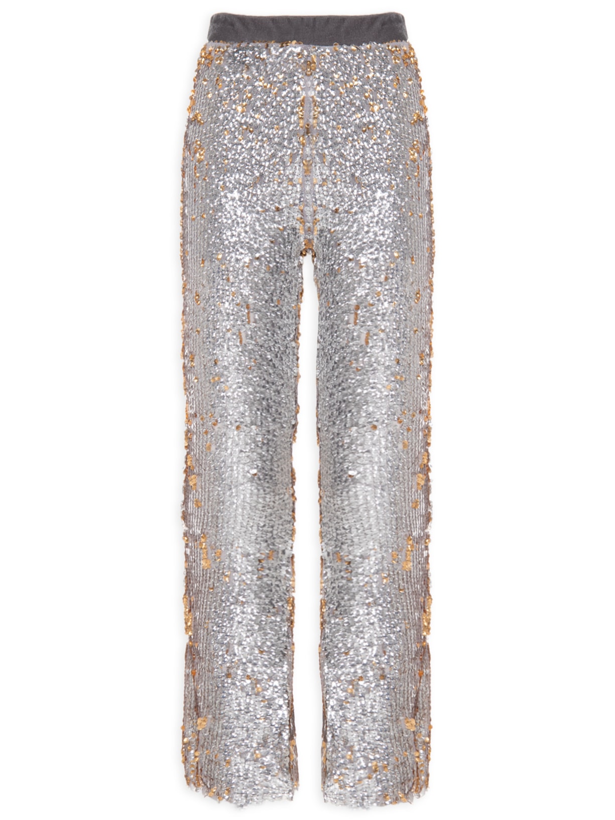 A calça prata é confeccionada em tecido leve com superfície em paetês dupla face, sendo a outra face dourada. A peça possui cintura alta, cós com recorte em veludo e elástico embutido, forro, comprimento cropped*, shape solto, caimento reto e acabamento pespontado.