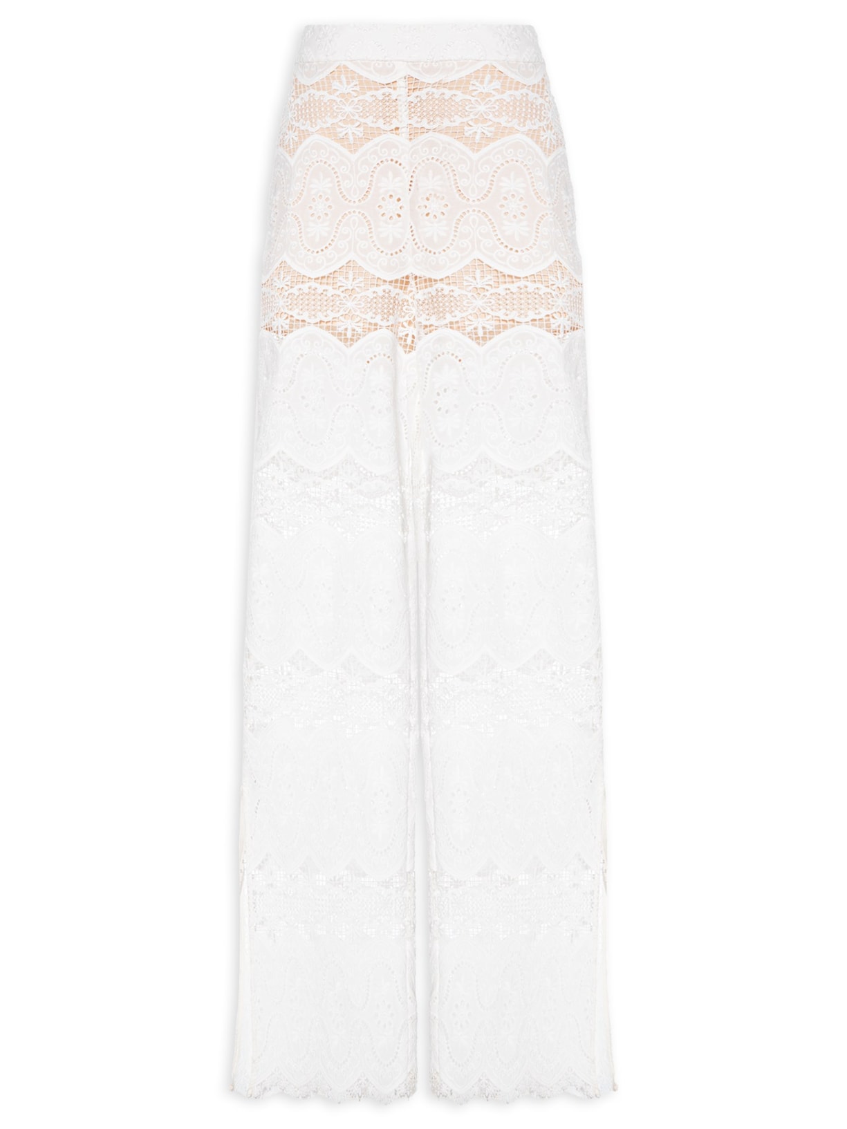 A calça off white é confeccionada em renda sem elasticidade. A peça solta ao corpo possui cintura alta, bolsos frontais de modelo faca, pences posteriores, fendas laterais, trama com recortes vazados, forro em short curto de cor contrastante, comprimento longo e fechamento lateral em zíper.