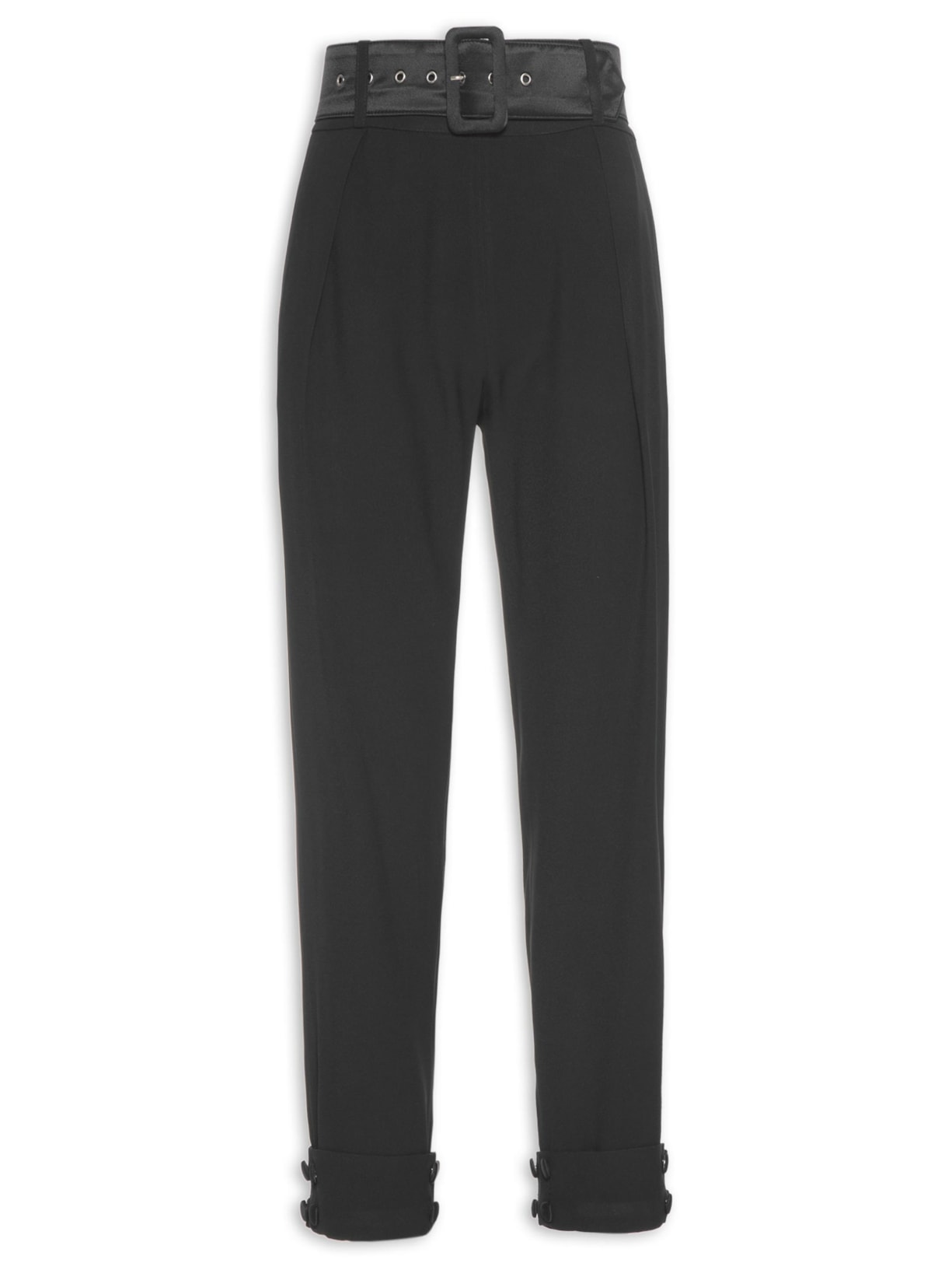 A calça preta é confeccionada em tecido leve. A peça possui cintura alta, bolsos frontais modelo faca, cós com passantes aplicados, pregas frontais e posteriores, detalhe de botões na barra, comprimento cropped, shape solto, caimento reto, acabamento pespontado e fechamento lateral por zíper invisível. Acompanha cinto de mesma cor e tecido para o uso opcional.