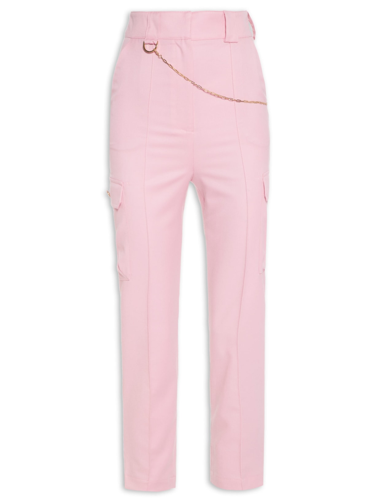 A calça rosa é confeccionada em lã. A peça de modelo cargo possui cintura alta, cós com passantes aplicados, bolsos frontais modelo faca, bolsos posteriores embutidos com fechamento por botão, bolsos laterais com fechamento por aba sobreposta e botões, recorte frontal, detalhe de corrente metalizada, shape solto, caimento reto, acabamento pespontado e fechamento frontal por colchetes e zíper.
