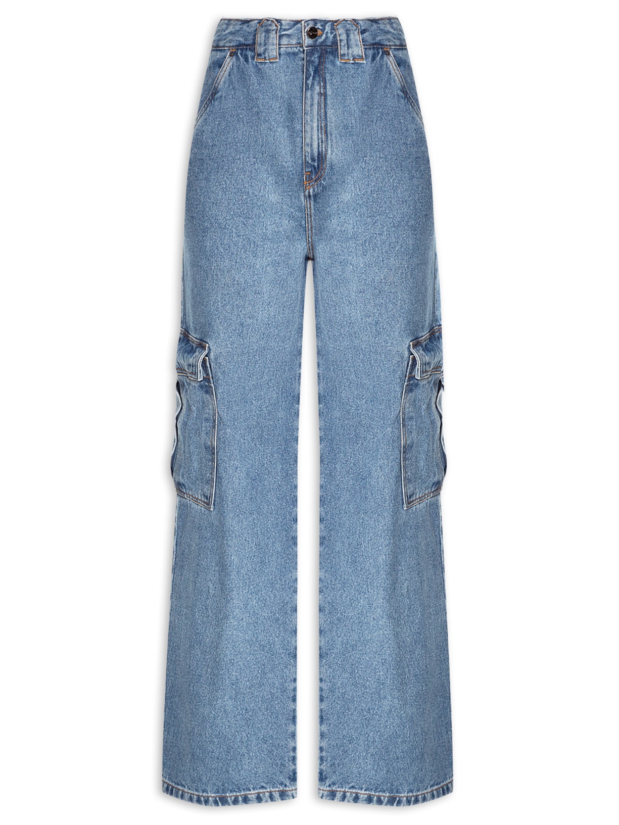 A calça azul é confeccionada em sarja com lavagem jeans sem elasticidade. A peça solta ao corpo, de modelo cargo, possui cintura alta, cós com passantes largos aplicados, bolsos faca frontais com rebites aplicados, bolsos utilitários na parte frontal com abas, bolsos posteriores com tag metalizada da marca aplicada, efeito estonado, comprimento longo e fechamento frontal por zíper e botão.