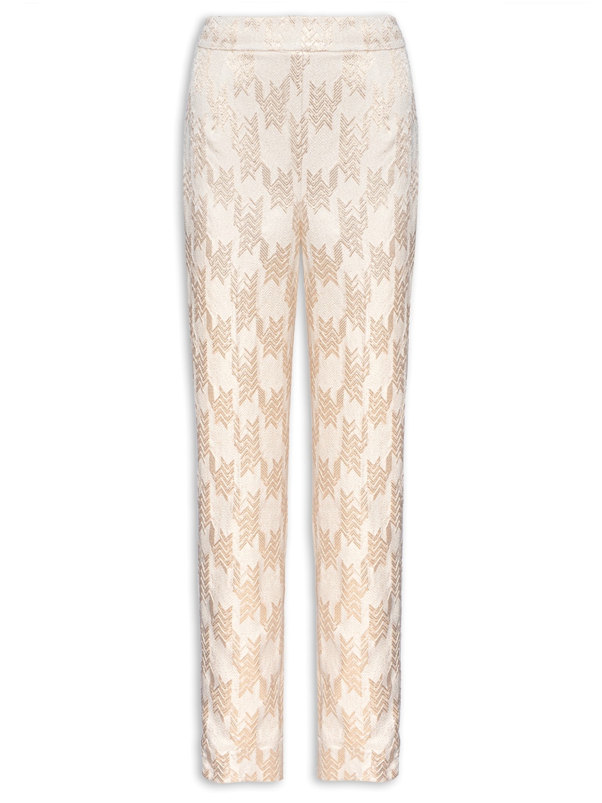 A calça bege é confeccionada em tecido leve com superfície texturizada, fios de lurex e sem elasticidade. A peça solta ao corpo possui cintura alta, pences frontais e posteriores, fendas laterais, barra estendida, forro, comprimento cropped* e fechamento lateral em zíper invisível.