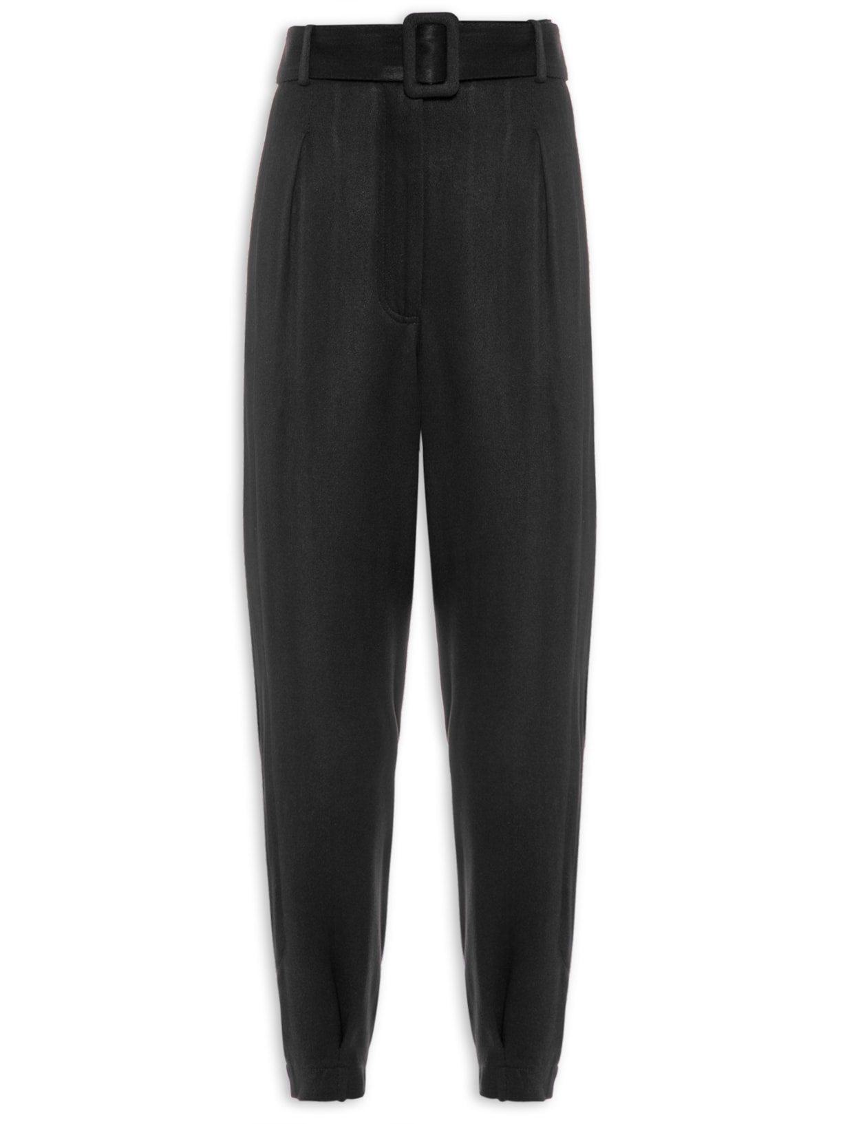 A calça preta é confeccionada em tecido leve. A peça possui cintura alta, cós com passantes, bolsos frontais embutidos, bolsos posteriores decorativos, pregas frontais na altura do cós e da barra, pences posteriores, recortes laterais vazados sobrepostos, comprimento cropped*, shape solto, caimento reto, acabamento pespontado e fechamento frontal por botão, zíper e colchetes. Acompanha cinto no mesmo tecido e cor com fechamento frontal por fivela forrada.