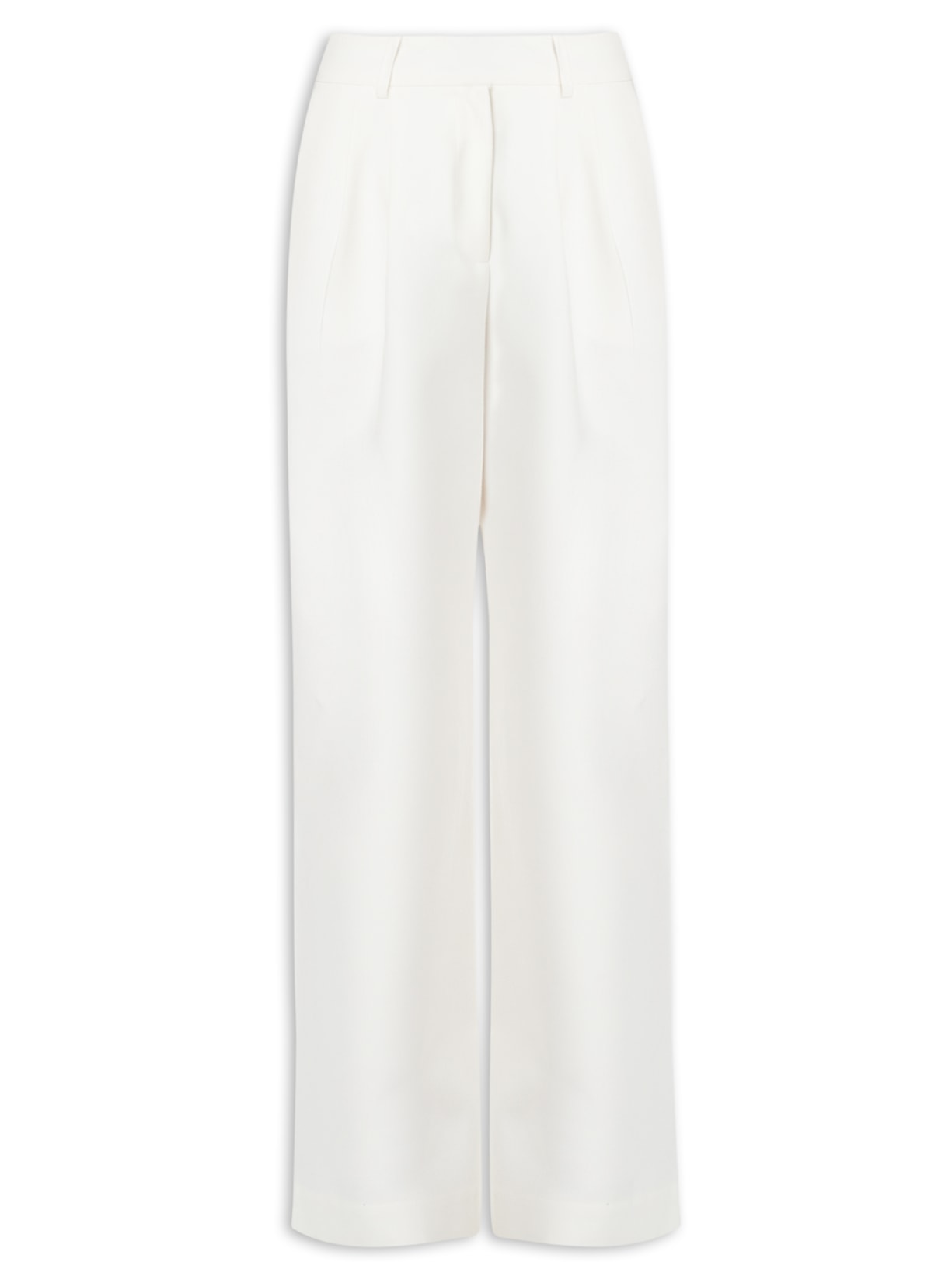 A calça branca é confeccionada em tecido encorpado sem elasticidade. A peça solta ao corpo, possui cintura alta, cós com passantes aplicados, pregas frontais, bolsos faca frontais, pences posteriores, bolso posterior embutido, comprimento longo, barra alongada e fechamento frontal por zíper, colchete e botão interno.