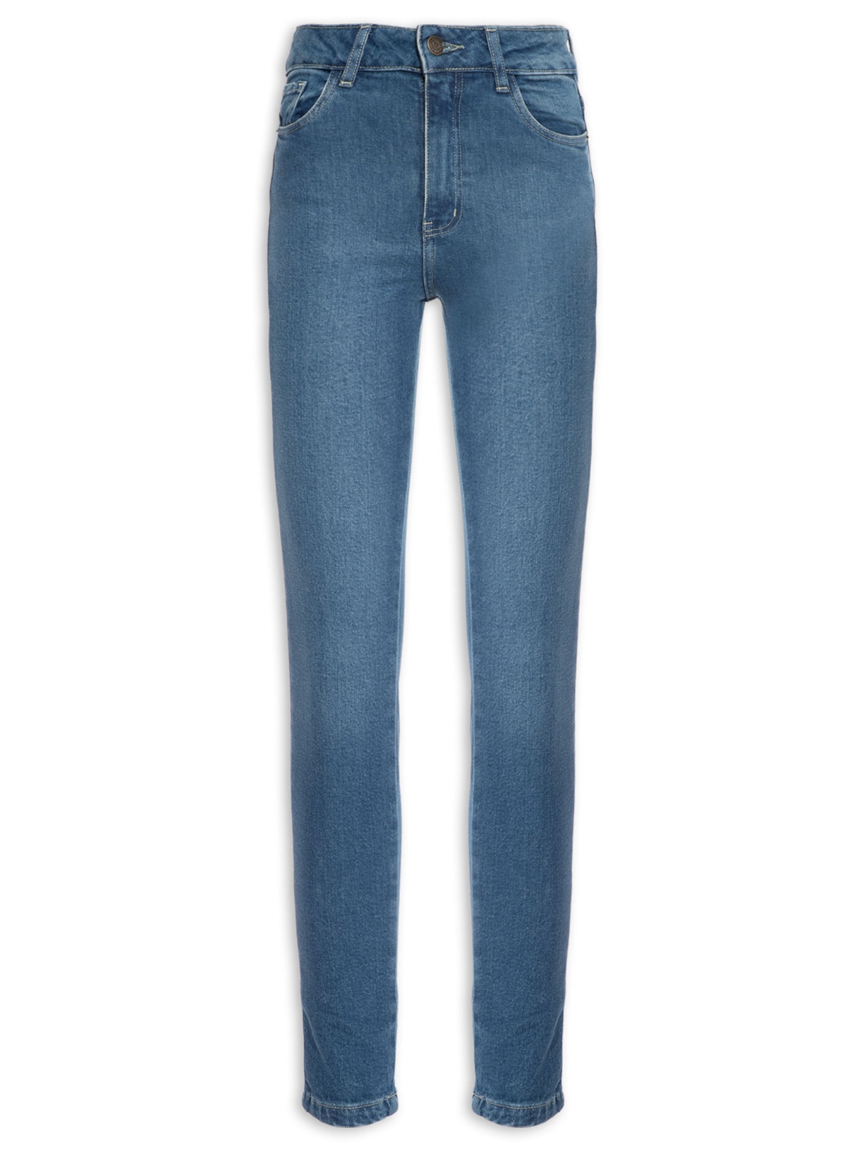 A calça azul é confeccionada em sarja com lavagem jeans. A peça de modelo skinny* possui cintura alta, cós com passantes aplicados, five pockets**, rebites metalizados aplicados na parte frontal, comprimento longo, shape justo, caimento reto, acabamento pespontado e fechamento frontal por botão e zíper.