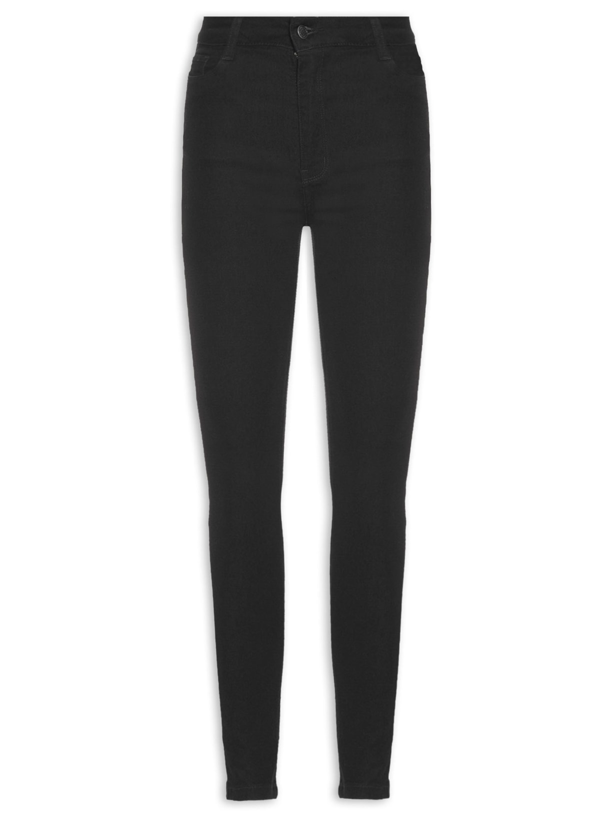 A calça preta é confeccionada em sarja. A peça de modelo skinny* possui cintura alta, cós com passantes aplicados, five pockets**, bordado posterior, comprimento longo, shape justo, caimento reto, acabamento pespontado e fechamento frontal por botão e zíper.