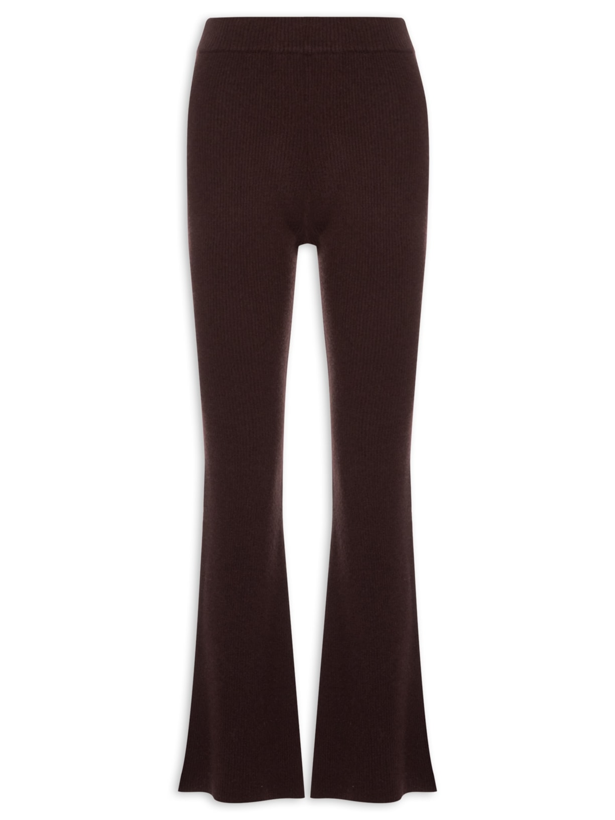 A calça marrom é confeccionado em lã com toque de cashmere e alta elasticidade. A peça justa ao corpo possui cós com elástico embutido, cintura alta, fendas laterais e comprimento longo.
