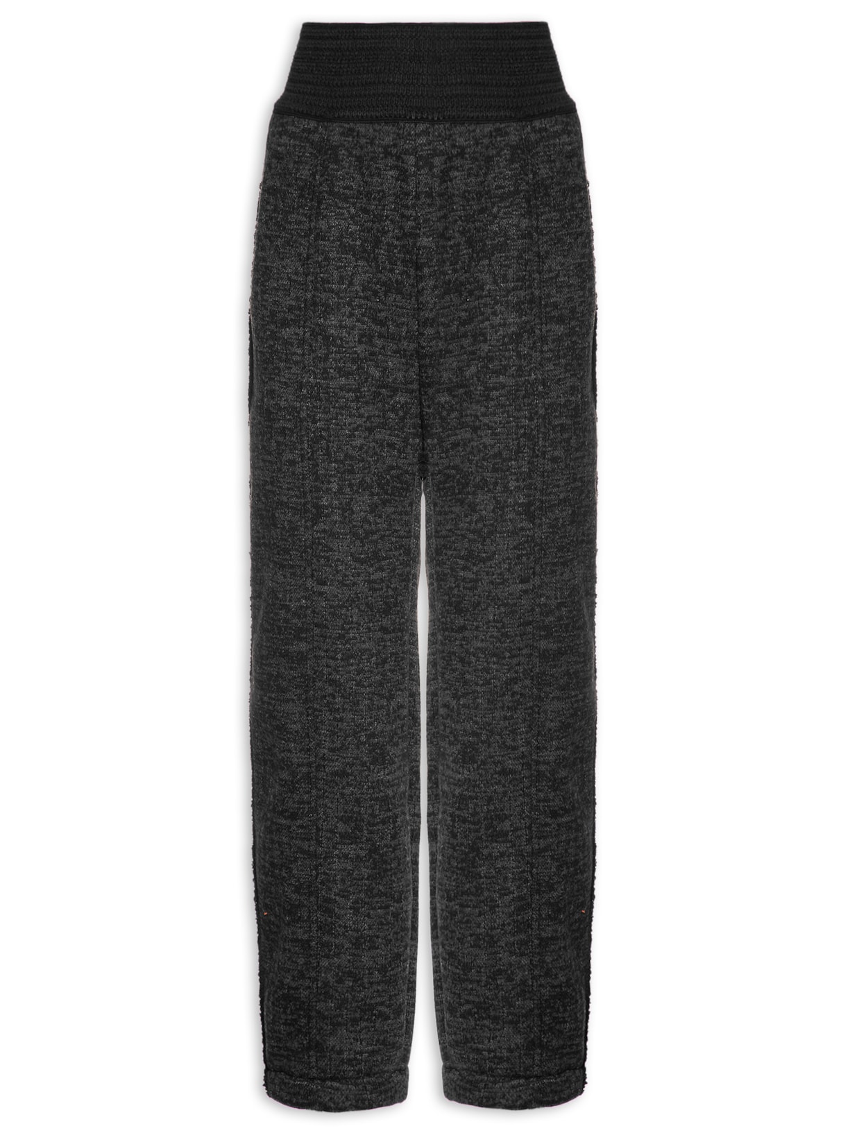 A calça preta é confeccionada em tecido encorpado com parte interna em alpaca sintética. A peça possui cintura alta, cós elástico, recorte posterior, recorte lateral em alpaca, comprimento cropped*, shape solto, caimento reto e acabamento pespontado.