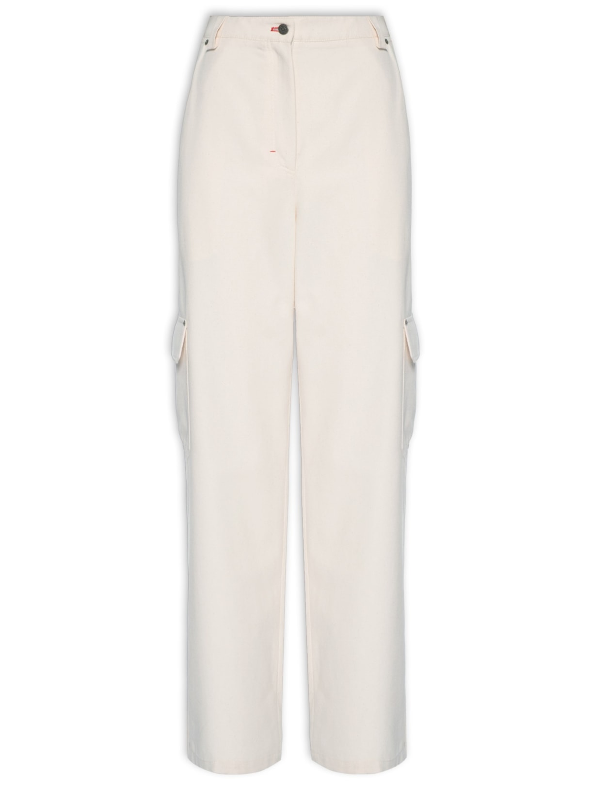 A calça off white é confeccionada em sarja sem elasticidade. A peça solta ao corpo, possui cintura alta, cós com passantes aplicados, bolsos faca frontais com rebites aplicados, faixa torcida aplicada na lateral, bolsos utilitários nas laterais com rebites, faixas aplicadas na parte posterior do cós com fivelas para regulagem, bolso posteriores com fechamento por aba com rebites aplicados, comprimento longo e fechamento frontal por zíper e botão.