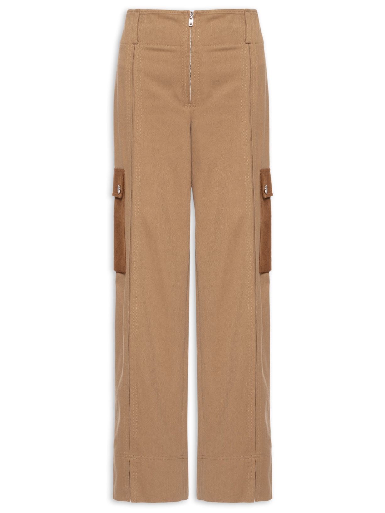 A calça marrom é confeccionada em sarja sem elasticidade. A peça solta ao corpo possui cintura alta, cós com passantes aplicados, bolsos laterais de modelo cargo em veludo cotelê em tom contrastante, nervuras frontais e posteriores, fendas frontais, comprimento longo e fechamento frontal em zíper e botão interno.