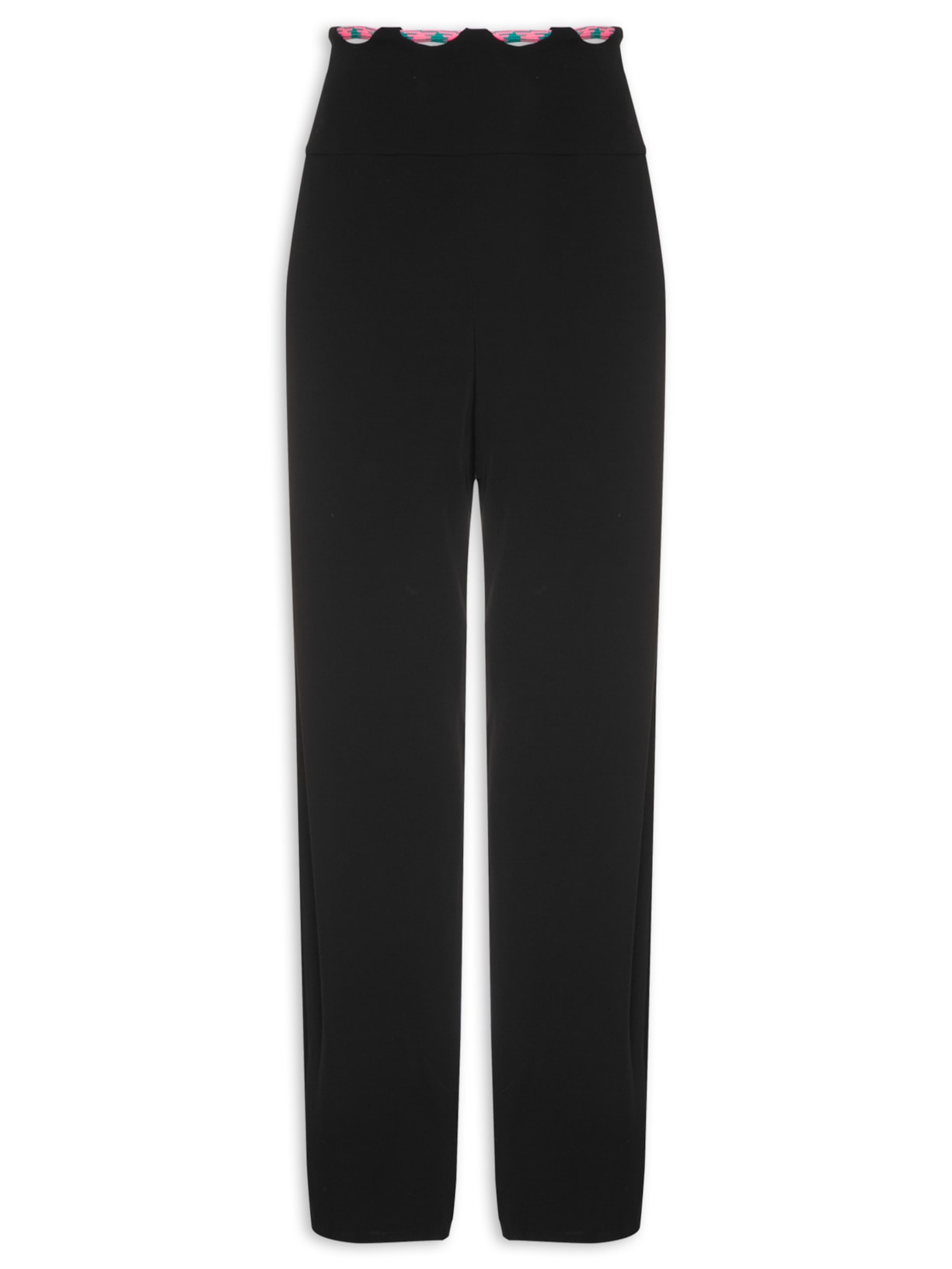 A calça preta é confeccionada em crepe. A peça possui cintura alta, recorte no cós com detalhes vazados e cordão de cor contrastante aplicado, shape solto, caimento reto, acabamento pespontado e fechamento frontal por zíper e colchetes.