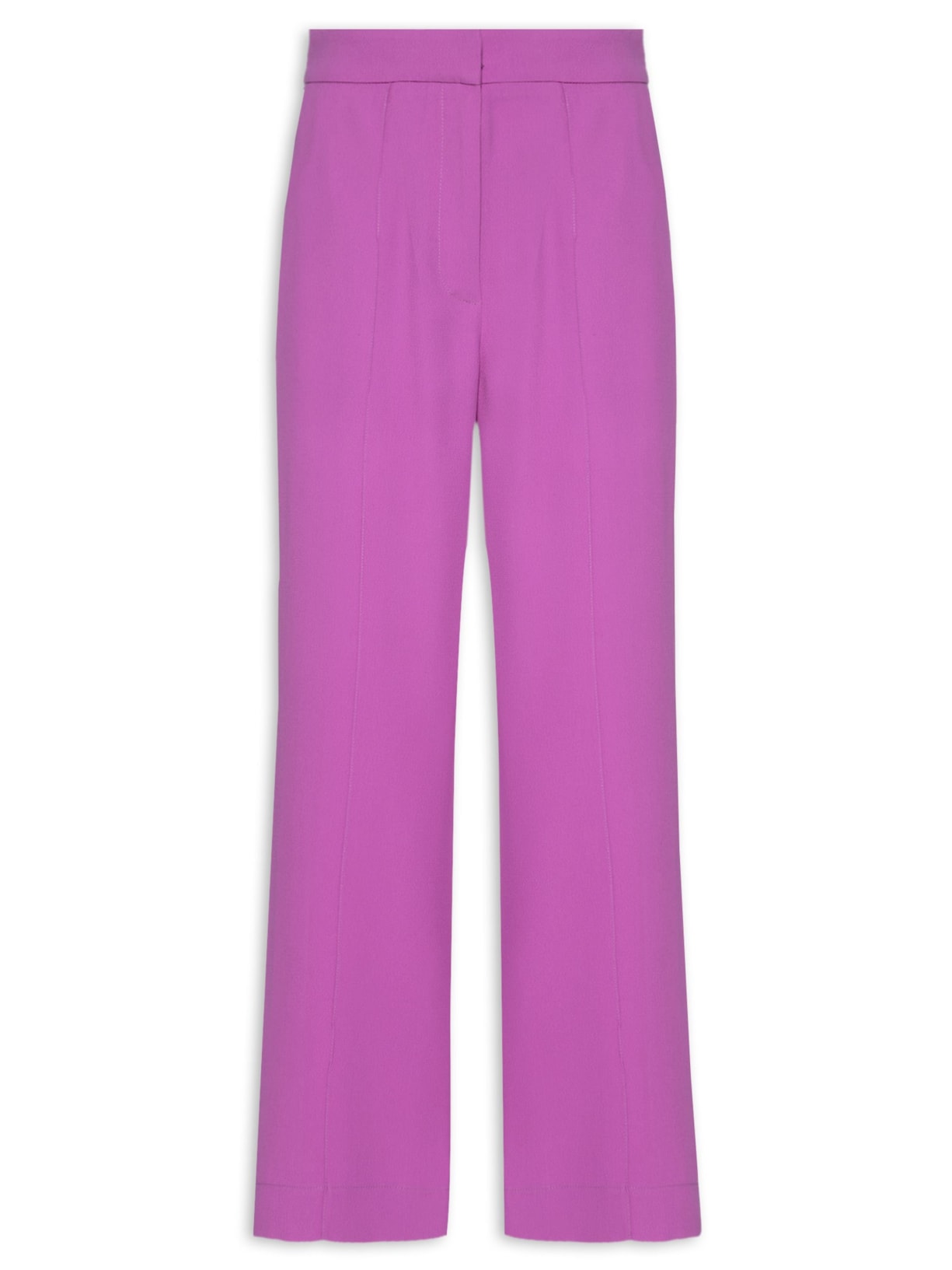 A calça roxa é confeccionada em crepe sem elasticidade. A peça solta ao corpo possui cintura alta, pences posteriores, bolsos frontais modelo faca, bolsos posteriores embutidos com fechamento por aba, recortes frontais, comprimento cropped* e fechamento frontal por colchete, botão e zíper.