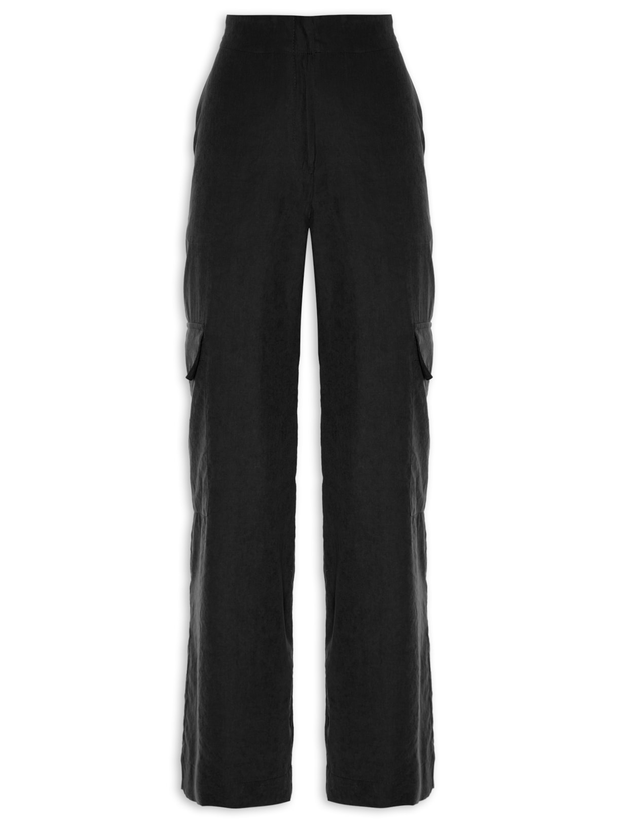 A calça preta é confeccionada em tecido leve. A peça possui cintura alta, recorte posterior, bolsos frontais modelo faca, bolsos laterais modelo cargo, comprimento longo, caimento reto, shape solto, acabamento pespontado e fechamento frontal por botão, colchete e zíper.