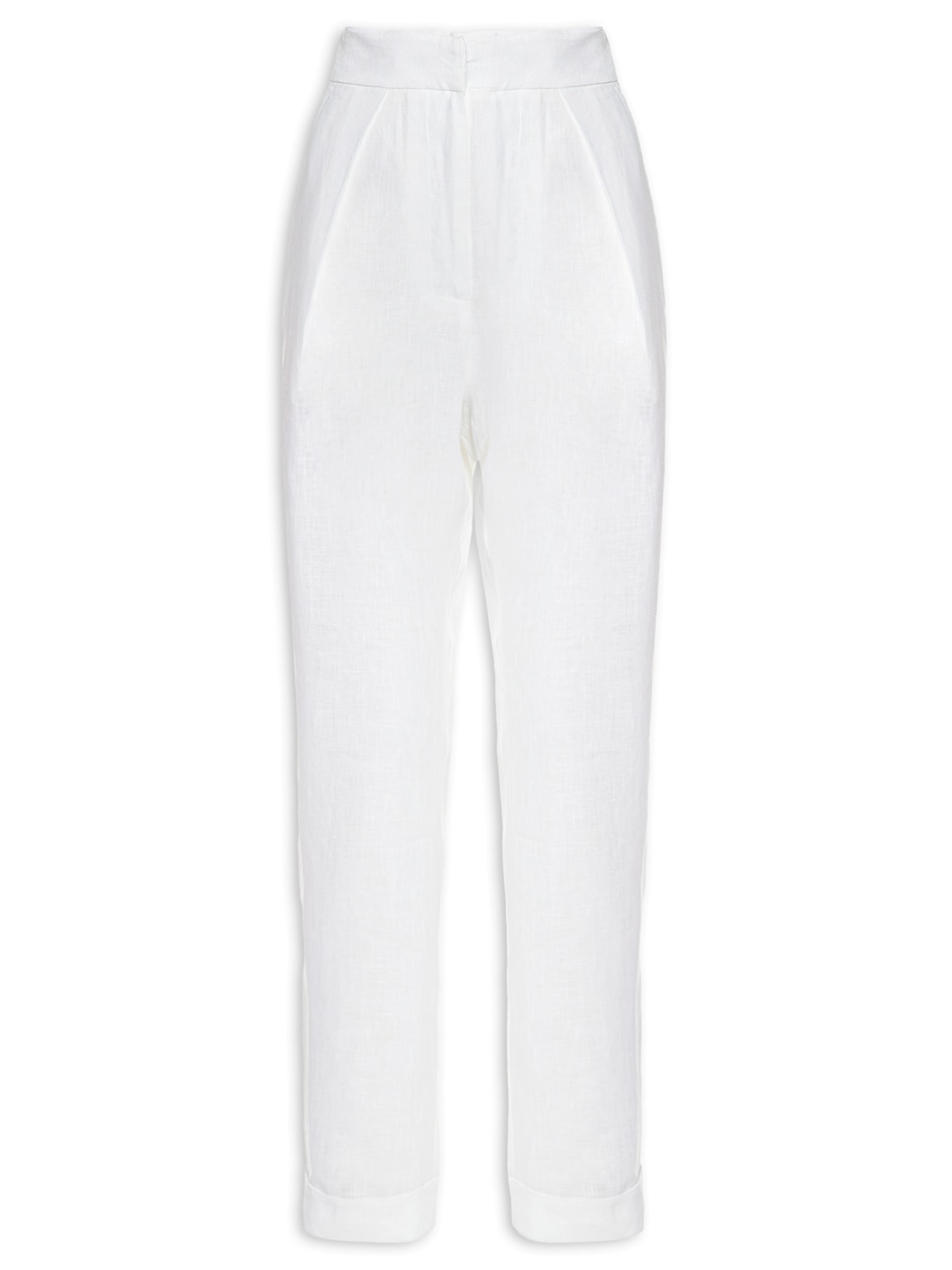 A calça off white é confeccionada em linho misto. A peça possui cintura alta, pences posteriores e pregas frontais na altura do cós, bolsos posteriores decorativos, bolsos frontais modelo faca, barras dobradas, forro, comprimento cropped*, shape solto, caimento reto, acabamento pespontado e fechamento frontal por botão, colchetes e zíper.