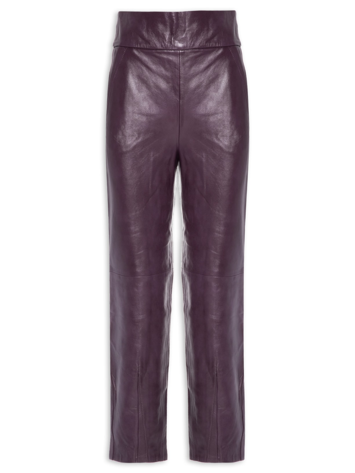 A calça roxa é confeccionada em couro caprino. A peça possui cintura alta, bolsos frontais de modelo faca, bolsos posteriores decorativos, recortes frontais na altura do joelho, recortes posteriores, pences frontais e posteriores na altura da barra, comprimento cropped*, shape justo, caimento reto, acabamento pespontado e fechamento lateral por zíper metalizado com puxador.