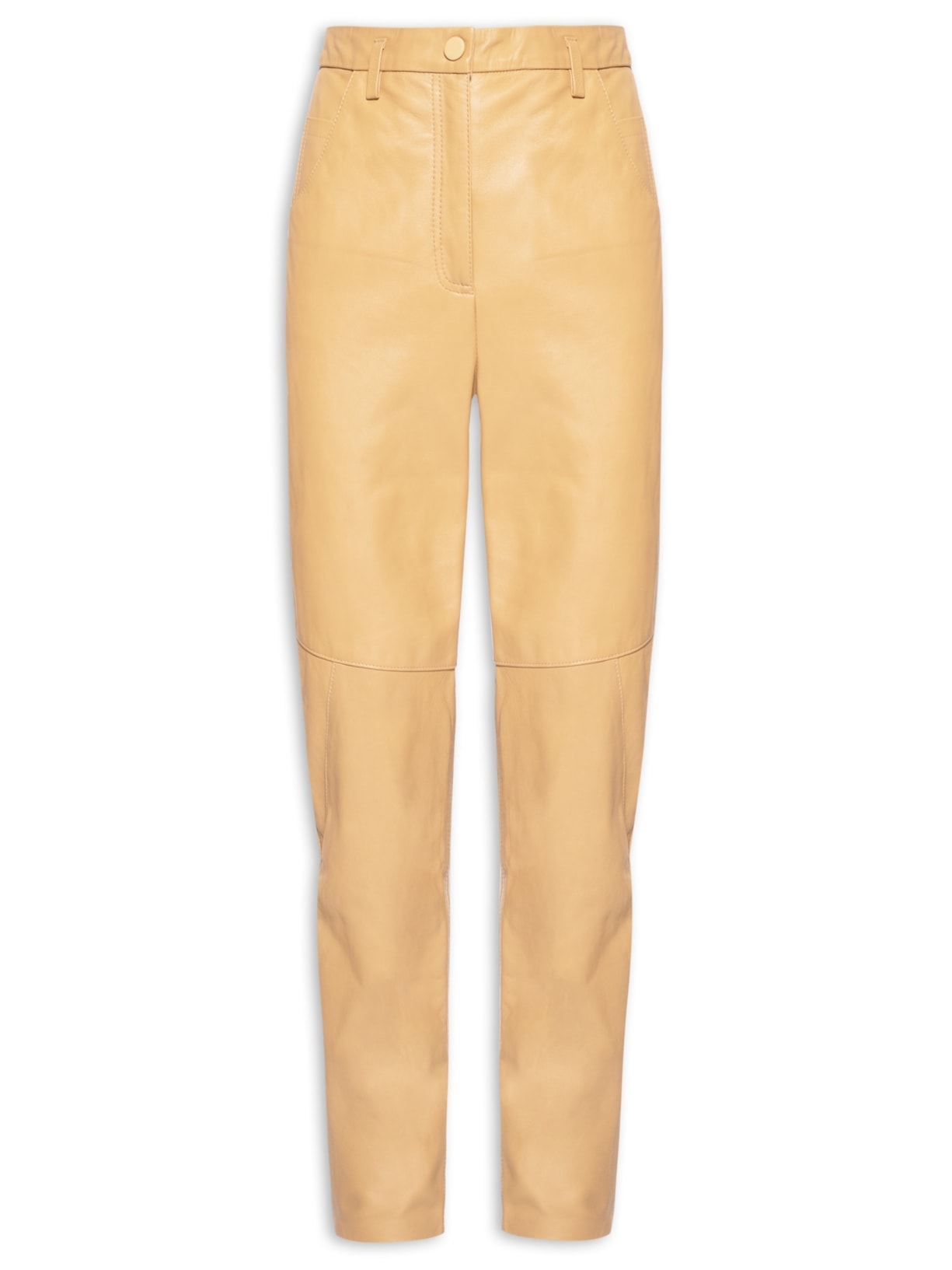 A calça marrom é confeccionada por couro sem elasticidade. A peça justa ao corpo de modelo mom* possui cintura média, passantes aplicados no cós, five pockets**, recortes frontais e posteriores, fechamento por zíper e botão frontal e comprimento cropped***.