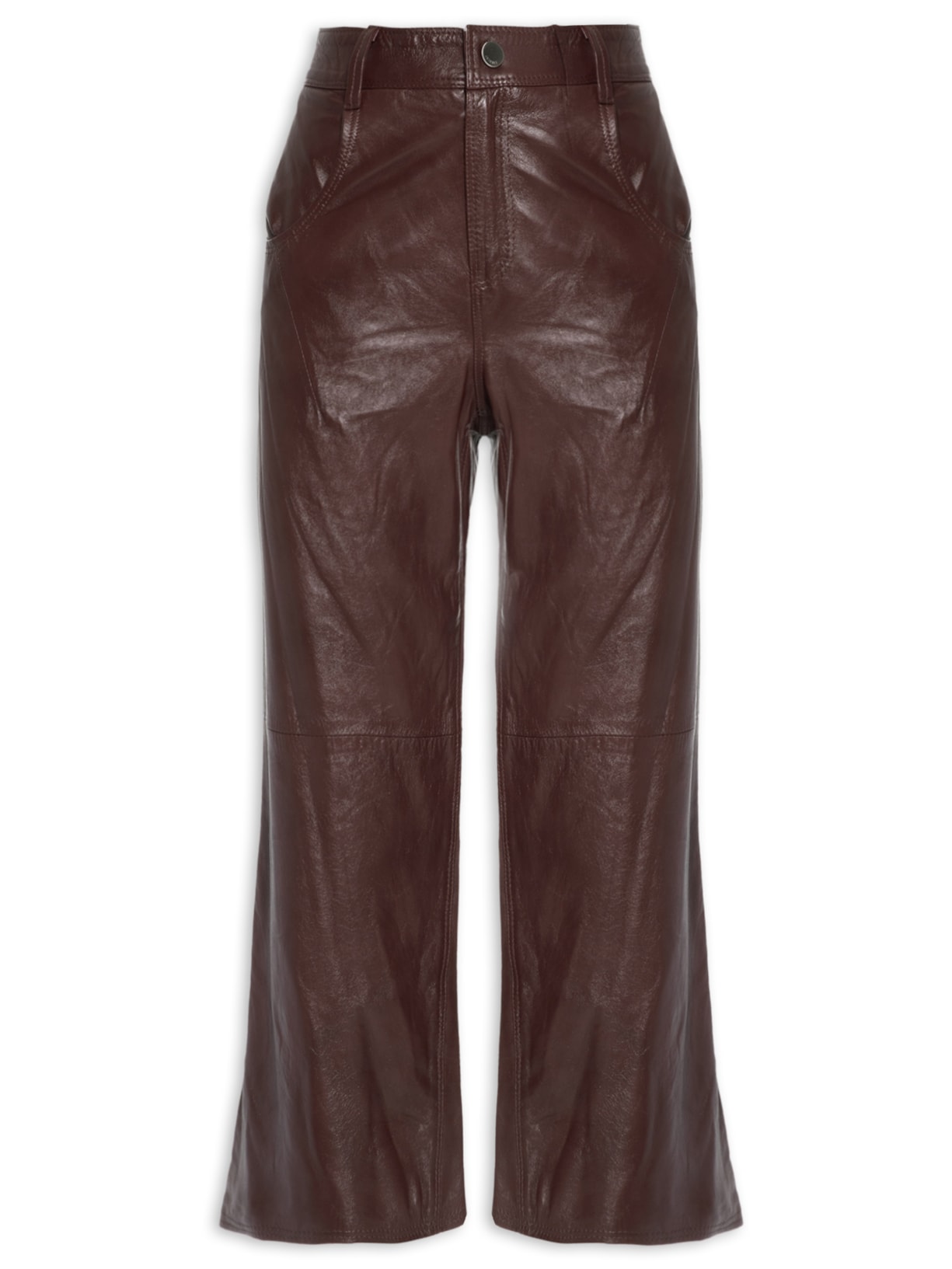 A calça marrom é confeccionada em couro. A peça possui cintura alta, passantes aplicados no cós, bolsos frontais e posteriores, recortes frontais e posteriores, comprimento cropped*, shape solto, caimento reto, acabamento pespontado e fechamento frontal por zíper e botão.