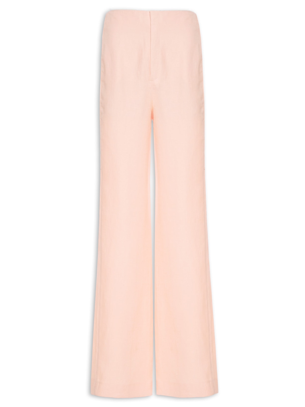 A calça rosa é confeccionada em linho sem elasticidade. A peça solta ao corpo possui cintura alta, bolsos frontais embutidos e posteriores decorativos, recortes laterais com detalhes de vivos, comprimento longo e fechamento frontal por zíper e colchetes.