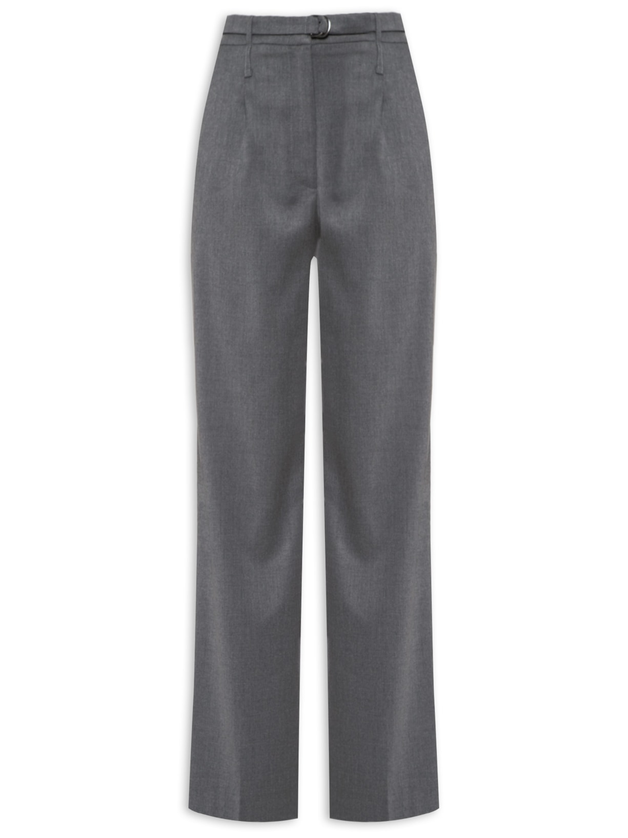 A calça cinza é confeccionada em tecido leve de baixa elasticidade. A peça solta ao corpo, possui cintura alta, passantes duplos aplicados, bolsos laterais modelo faca, tag metalizada da marca aplicada na parte posterior da cintura, pences posteriores, pregas frontais, bolsos posteriores embutidos decorativos, comprimento longo, fechamento frontal por zíper metálico, colchete e abotoamento interno. Acompanha cinto de mesma cor e tecido para uso opcional.