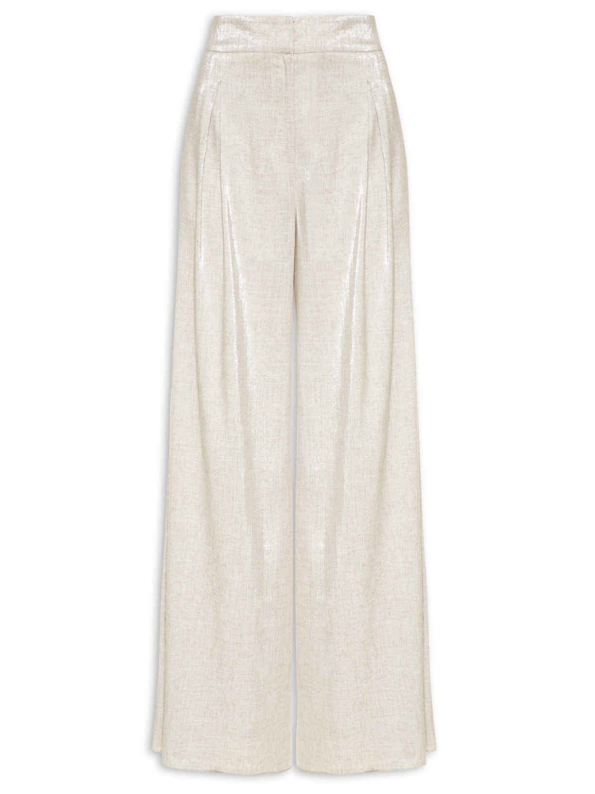 A calça prata é confeccionada em tecido leve com fios metalizados e toque de linho. A peça possui cintura alta, pregas frontais, bolsos frontais de modelo faca, bolsos posteriores decorativos, meio forro, comprimento longo e fechamento frontal por botão, colchetes e zíper.