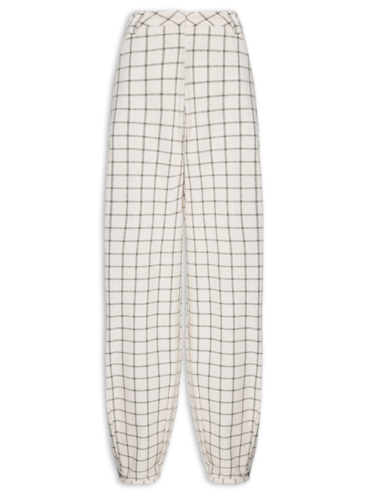 Para descomplicar e alcançar um look de impacto, invista em uma boa calça de xadrez! Aposte nesta da Aluf combinada com um top na mesma padronagem, brincos, bolsa e sandália flat. O resultado é um visual fresh e cool.