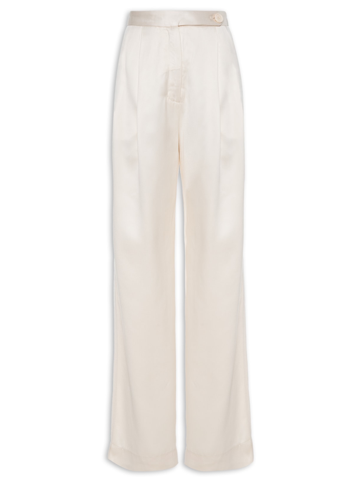 A calça bege é confeccionada em tecido leve com um toque de seda sem elasticidade. A peça solta ao corpo possui cintura alta, pregas aplicadas no cós, bolsos frontais e posteriores decorativos, fechamento em zíper e botão e comprimento longo.