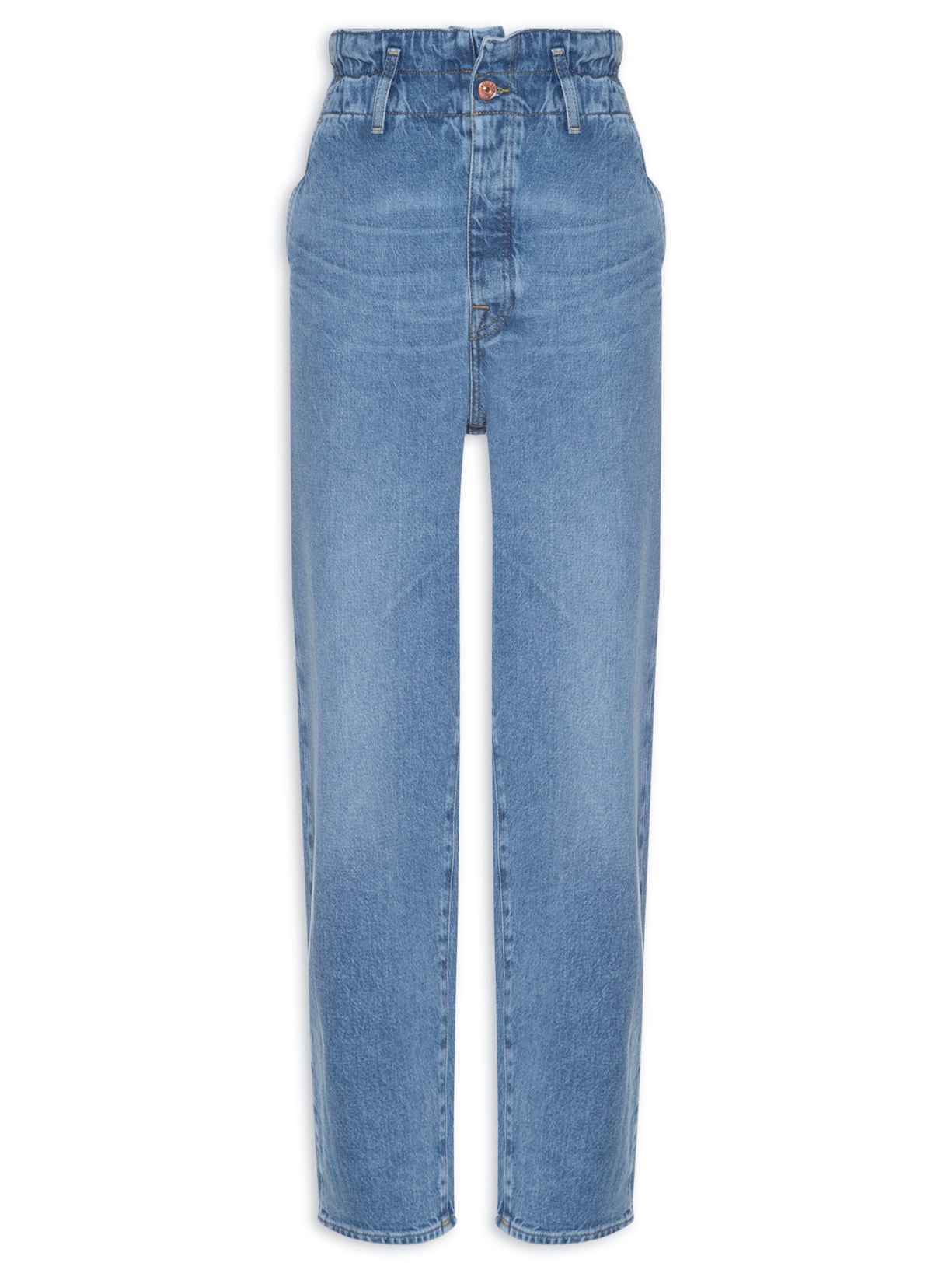 A calça azul é confeccionada em sarja com lavagem em jeans. A peça do modelo mom* possui cintura alta, cós com elástico embutido e passantes aplicados, bolsos frontais do mdoelo faca, bolsos posteriores, tag da marca bordada no bolso posterior, rebites, comprimento longo, shape solto, caimento reto, acabamento pespontado e fechamento frontal por botão e zíper,