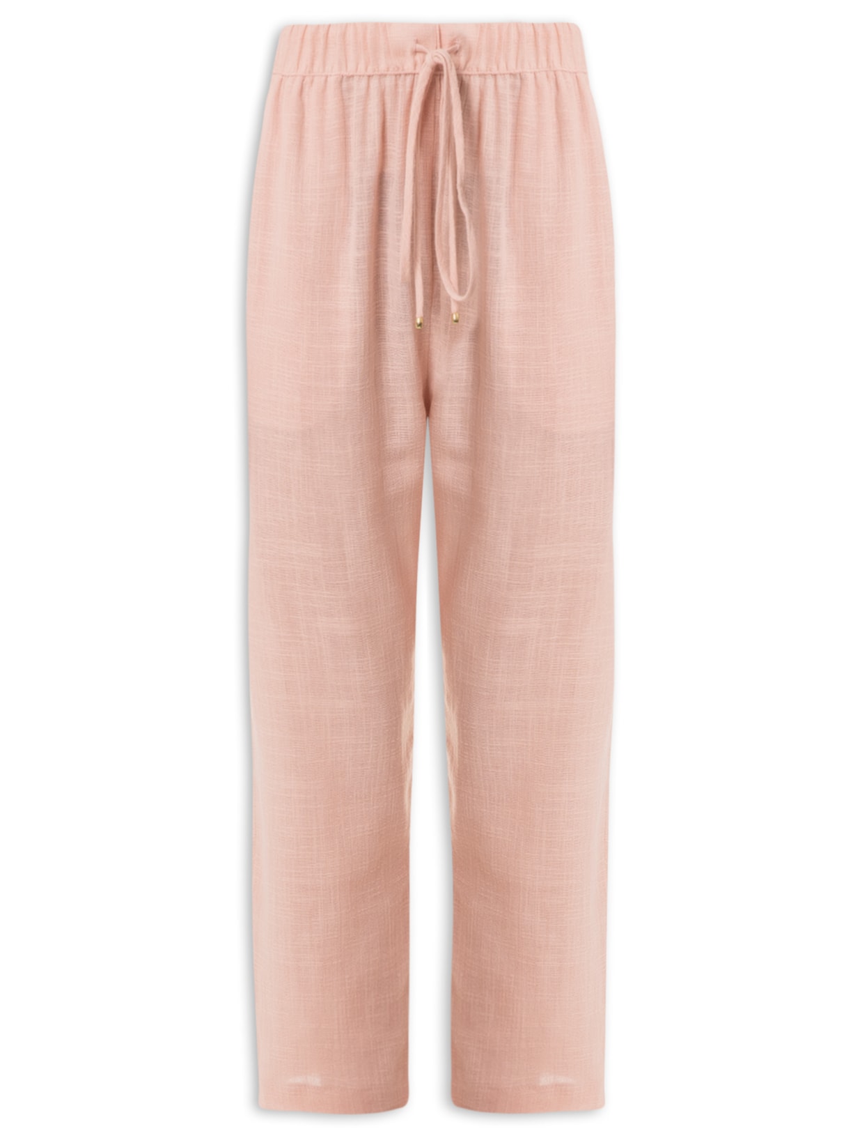 A calça bege é confeccionada em tecido leve com toque de linho sem elasticidade. A peça solta ao corpo, possui cintura alta, cós com elástico e cordão embutido para amarração frontal, bolsos faca frontais, barra alongada e comprimento cropped*.