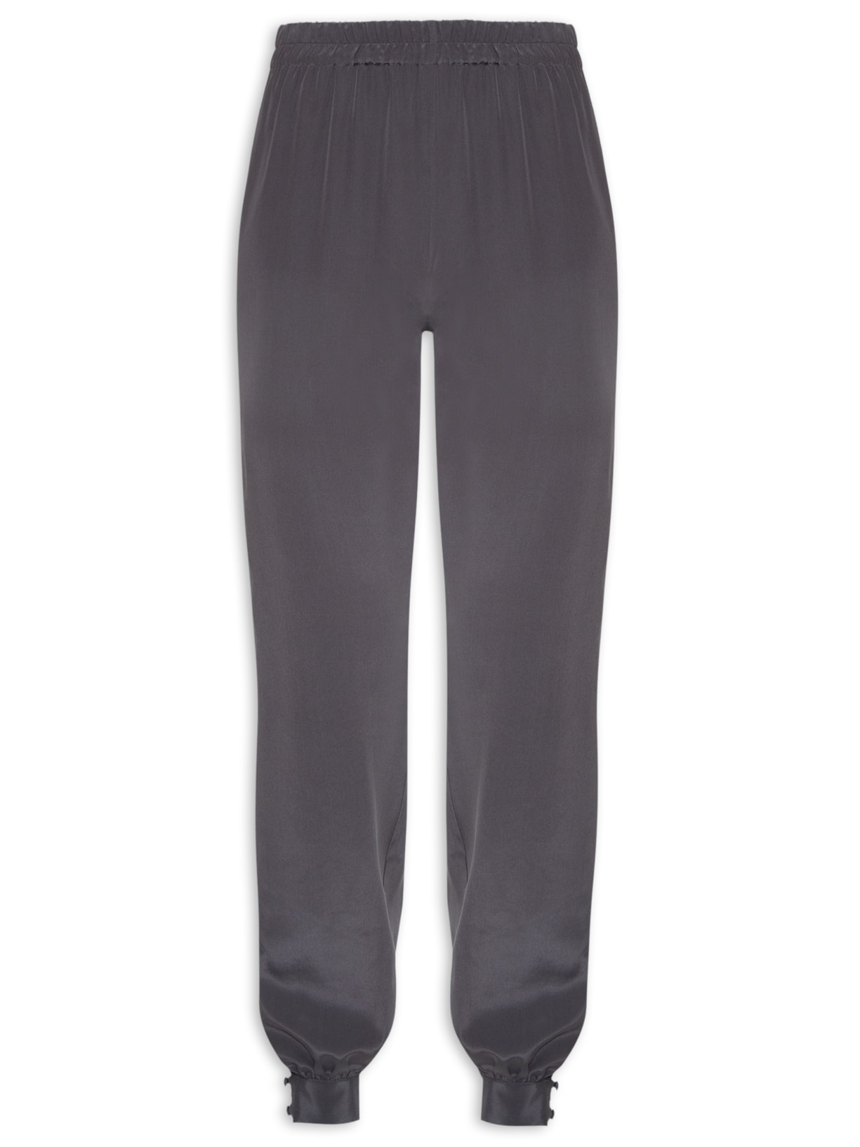 A calça cinza é confeccionada em seda sem elasticidade. A peça solta ao corpo, possui cintura alta, cós com elástico embutido, bolsos frontais embutidos e barra afunilada com franzido, comprimento longo e abotoamento.