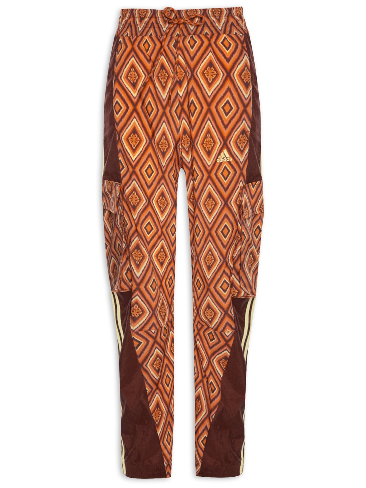 A calça marrom é confeccionada em nylon sem elasticidade. A peça solta ao corpo possui cintura alta, cós com elástico e cordão embutido para ajuste, bolsos frontais embutidos, recortes laterais que se estendem as partes posterior e frontal com listras em faixa de gorgurão na cor off white, bolsos laterais modelo cargo, estampa geométrica em cores contrastantes, elástico embutido nas barras e comprimento longo.