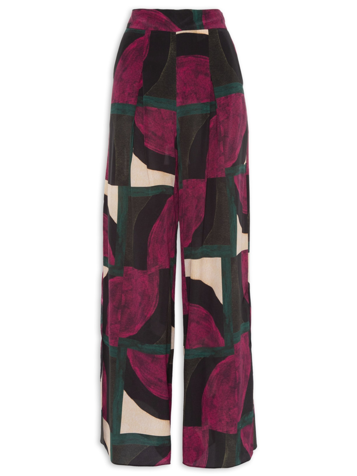 A calça vinho é confeccionada em seda. A peça possui cintura alta, logo da marca aplicado em metal na parte posterior na altura do cós, pregas frontais, bolsos frontais modelo faca, estampa geométrica em cores contrastantes, fendas laterais, meio forro, comprimento longo, shape solto, caimento reto, acabamento pespontado e fechamento lateral por zíper invisível.