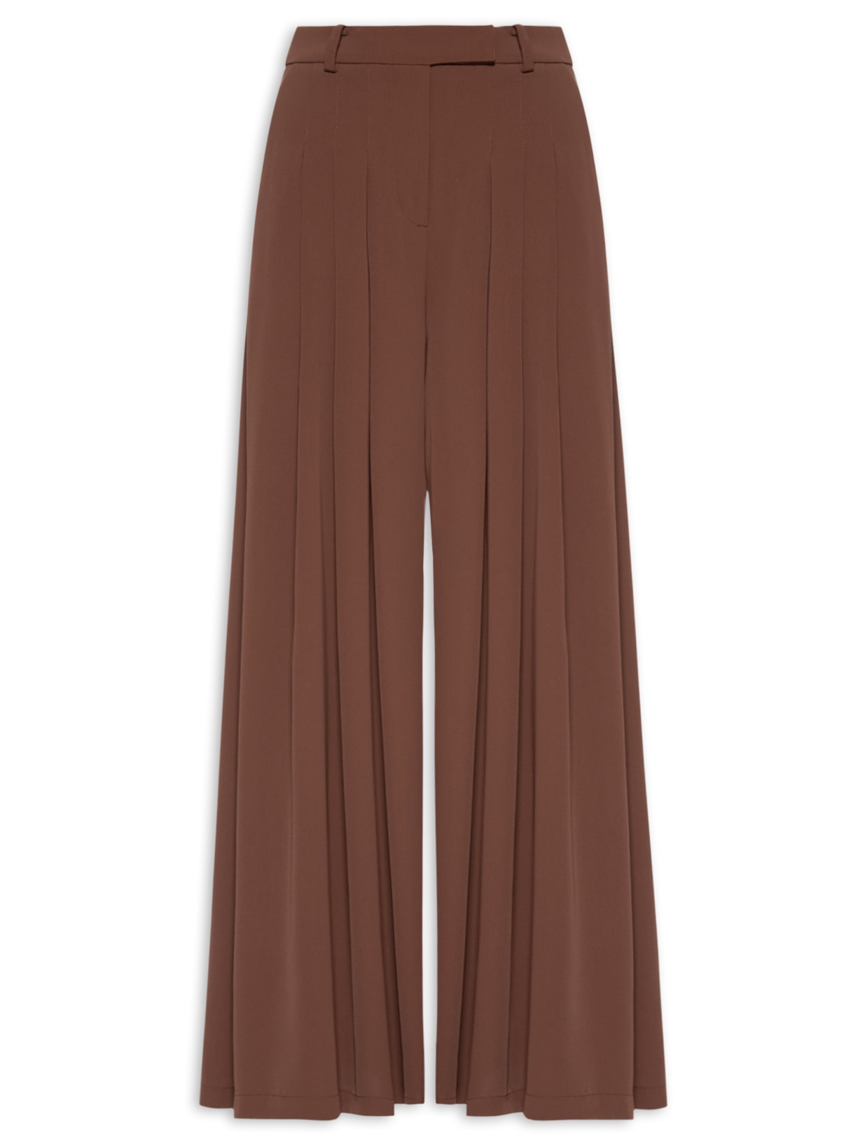 A calça marrom é confeccionada em tecido leve sem elasticidade. A peça solta ao corpo de modelo pantalona possui cintura alta, cós com passantes aplicados, bolsos frontais, bolsos posteriores decorativos, pregas frontais, comprimento longo e fechamento frontal por zíper e colchetes.