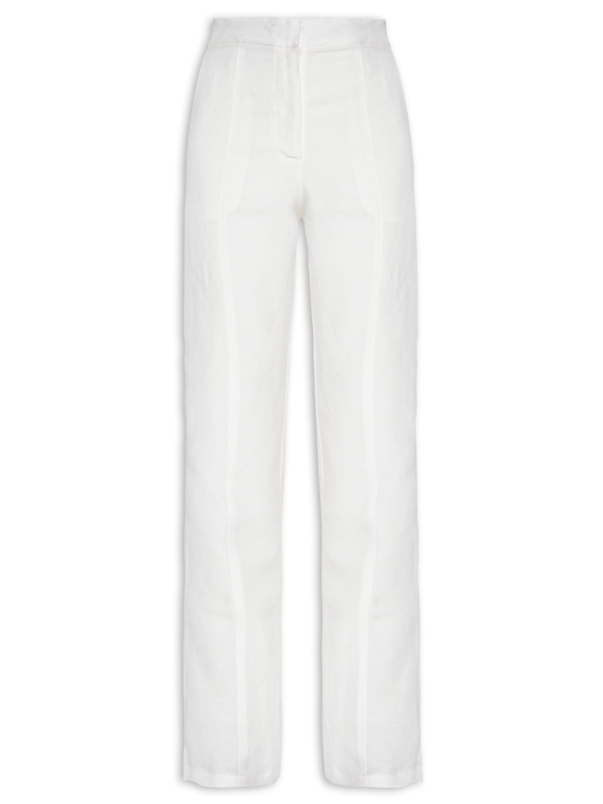 A calça branca é confeccionada em tecido leve com toque de linho sem elasticidade. A peça solta ao corpo possui cintura alta, recorte na parte frontal, bolsos frontais modelo faca, pences posteriores, fendas laterias, comprimento longo e fechamento frontal por zíper e colchetes.