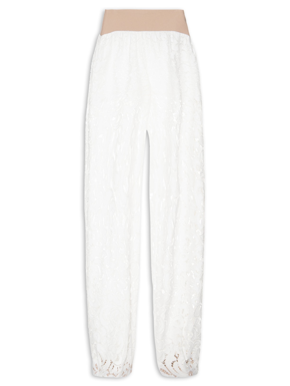 A calça off white é confeccionada em renda. A peça possui cintura alta, cós em tecido leve com superfície texturizada em cor contrastante, meio forro, transparência, detalhes de pregas na altura da barra, comprimento cropped*, shape solto, caimento reto, acabamento pespontado e fechamento lateral por zíper invisível.