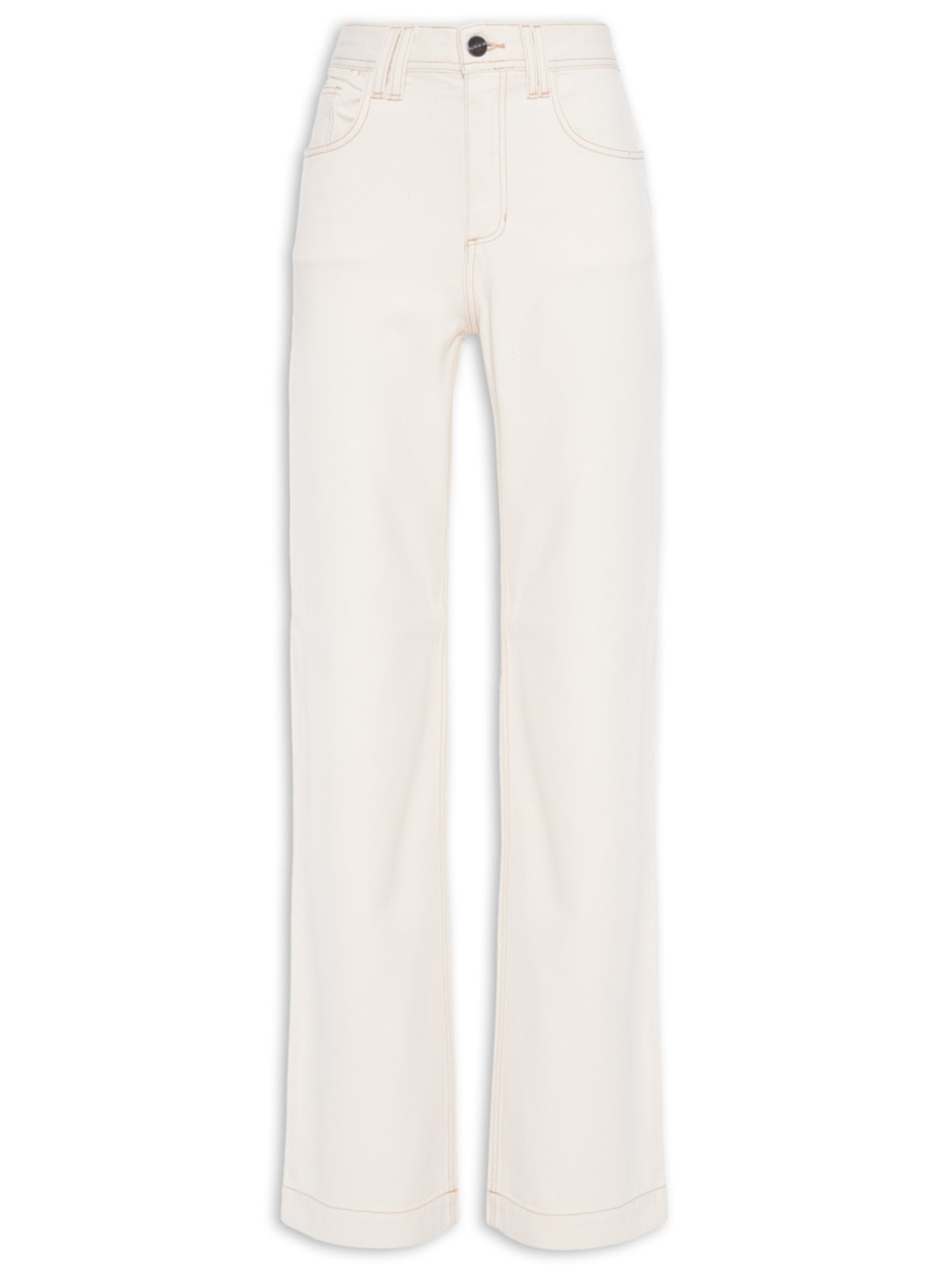 A calça off white é confeccionada em sarja. A peça possui cintura alta, cós com passantes, recorte posterior, five pockets*, logo da marca aplicado em metal no bolso posterior, comprimento longo, shape solto, caimento reto, acabamento pespontado em cor contrastante e fechamento frontal por botão e zíper.